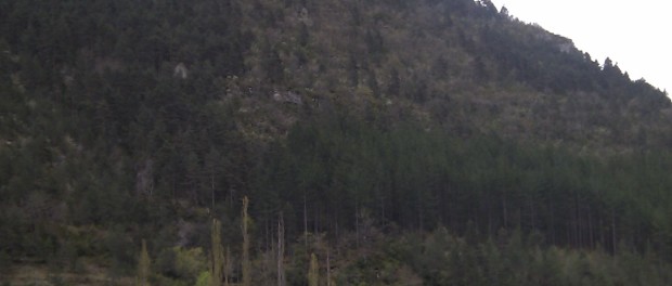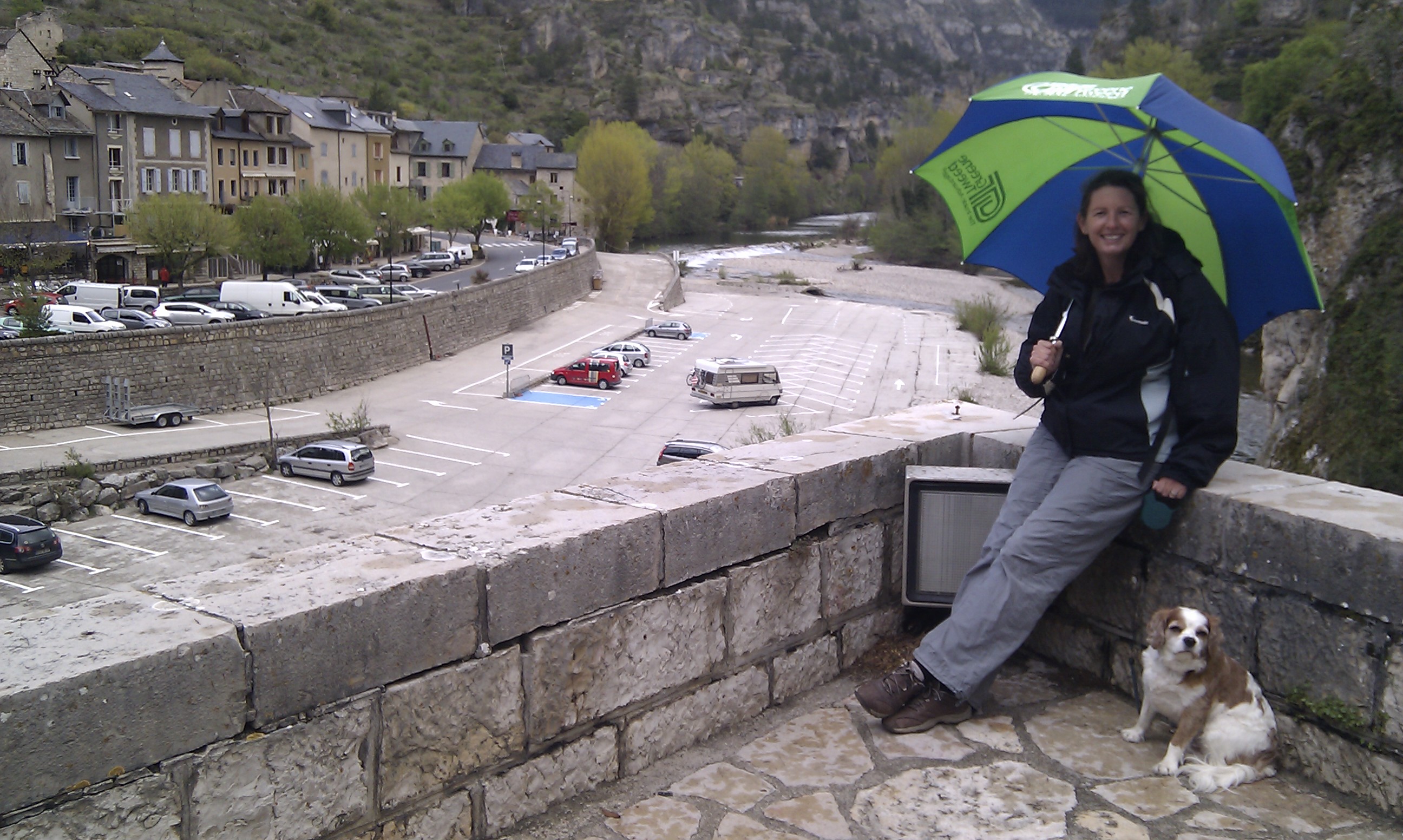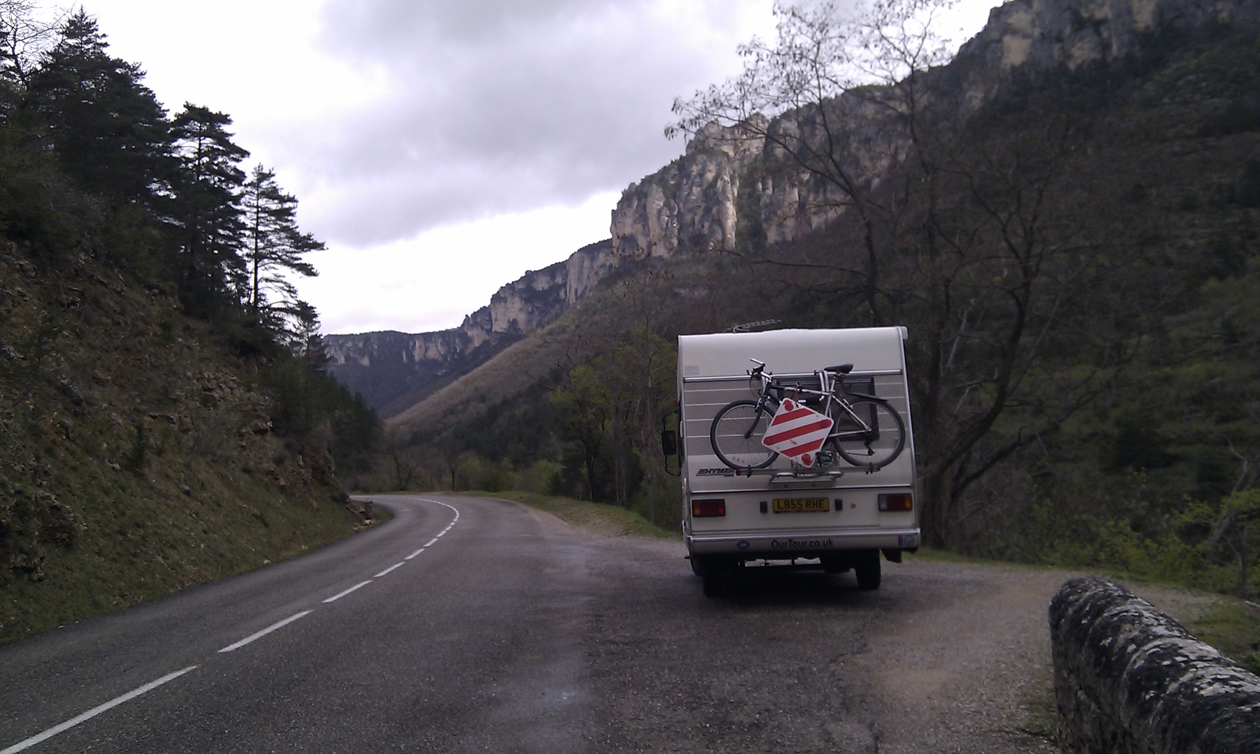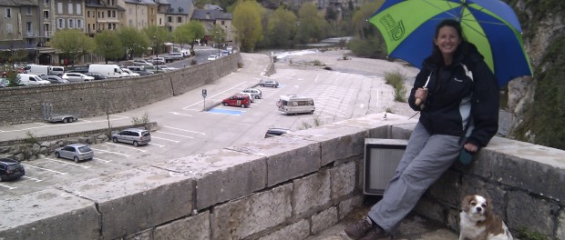 Another half an hour of 30kph twisties brings us into Florac where we’re being rapidly surrounded by huge shiny new French motorhomes. Charlie’s snoring having walked all of about 2 miles, Ju’s writing and I’m looking at the scenery and the map. Ah, another motorhome arrives, good job we got in early!