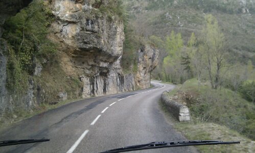 Les Gorges du Tarn call. The engineer who’d checked Dave’s habitation equipment over when we first got him had enthused about the Tarn river and the canoeing trip he’d done here. As we drove along the start of the Gorge, with the roaring gently river below us, I could see the attraction. I wasn’t too impressed with the Gorge though, I’d expected vertical cliffs, narrow winding roads, rock tunnels, precipitous houses and chateaux.