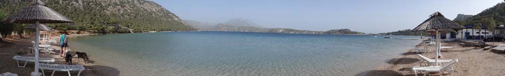 The world brought to rights, we ended up here, just a few hundred metres away, which is even by my own admission, a much safer spot than the one up top. We grabbed drinks at the taverna, eyeballing all the roaming dogs and behind them the gorgeous view over the lake, sea, thing (it’s lake-shaped, but open at one end to the sea). Walking inside to ask if we could stay here the night, we found the taverna owner soundly asleep with the TV on. One of the waiters spoke English and couldn’t be more friendly: ‘no police here, very quiet, if the police come, tell them you are with Kostas’ Restaurant’. Happy days, for the price of a beer and a glass of lemonade.