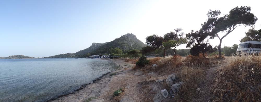 Dave the motorhome has the official sanction of the adjacent Kostas’ Restaurant to rest here under the pines for the night, up against the sea-water lake at Limini Vouliagmenis (N38.032653 E22.873846). We’re on the North-East edge of the Peloponnese, on the Gulf of Corinth, and it is ruggedly beautiful.