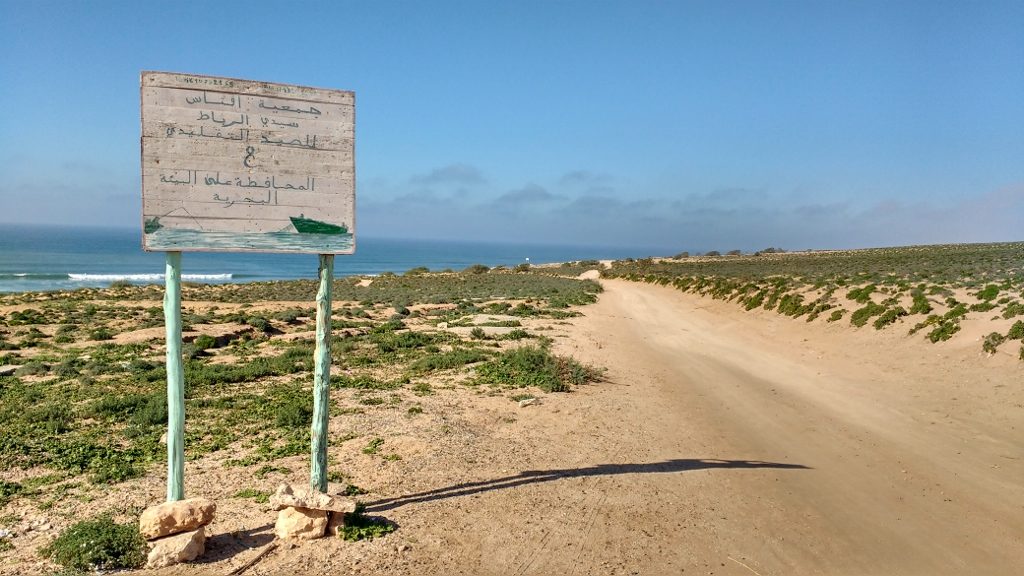 Out of Agadir the towns and sporadic, poor quality development eventually petered out, leaving us among scrub. Off the N1, which had amused us with signs saying ‘1236km to Dakhla’, the road was rumbling but good quality tarmac. Wide enough for two vehicles to pass, though we didn’t see any, just sheep grazing alongside round tents. At one point the road entered a town and in some sort of Blazing Saddles surrealism flipped into a perfect four carriageway road, devoid of all vehicles, built ready for a sudden influx of traffic which I hope will never come. At the village of Sidi R’Bat, the tarmac ended and we rolled cautiously the last few hundred meters through the concrete buildings and onto this patch of land.