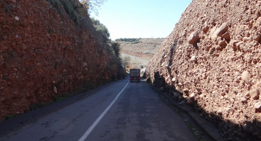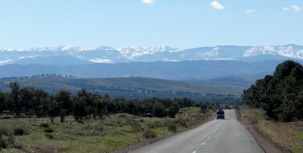 The drive here wasn’t anything like as difficult as I’d built it up to be. We took the R304, and then the R210 from Ouzoud, both yellow-classification roads (one down from red). The obvious route on the map was to take the white classification road (one down from yellow, you following this?) up to the red N8, and use that to get into the city. We checked in with Paul and he confirmed the white road was tarred and passable for us, but that the N8 was a pig of a road, not scenic, busy with traffic and we would be much better off following the yellow. We took his advice and were rewarded with an easy drive in, on good quality and quiet roads, with the mountains of the Middle and High Atlas snow-white to our left.