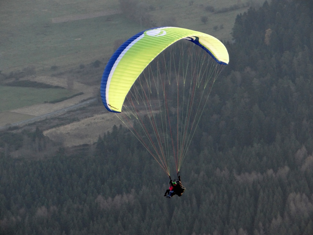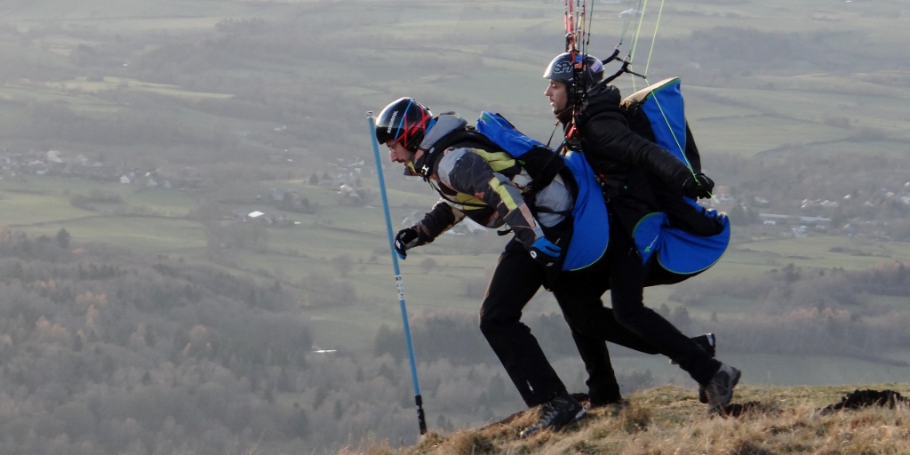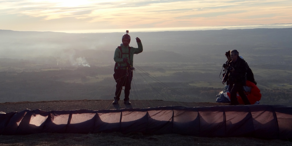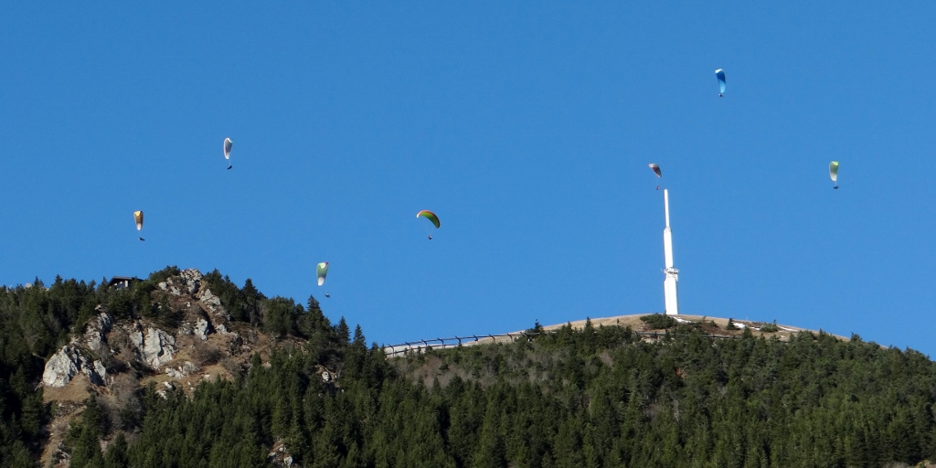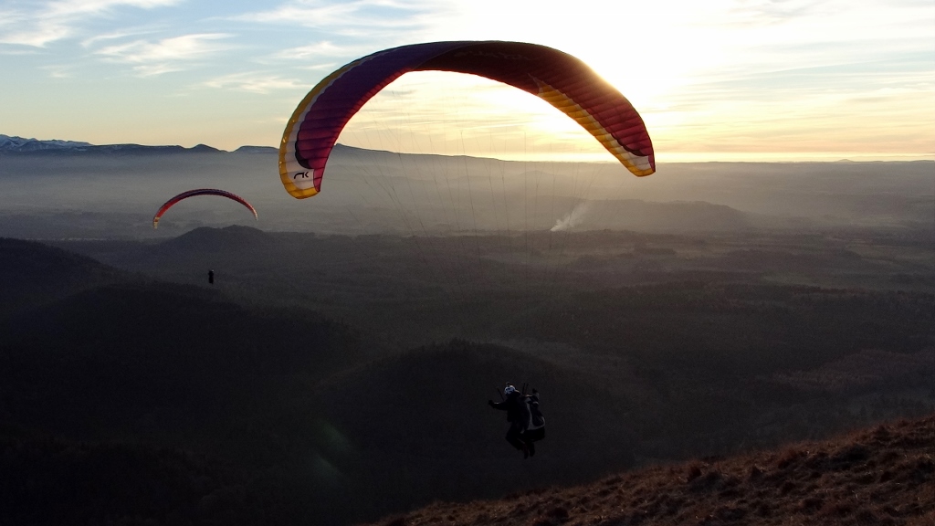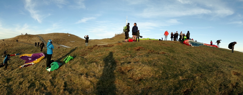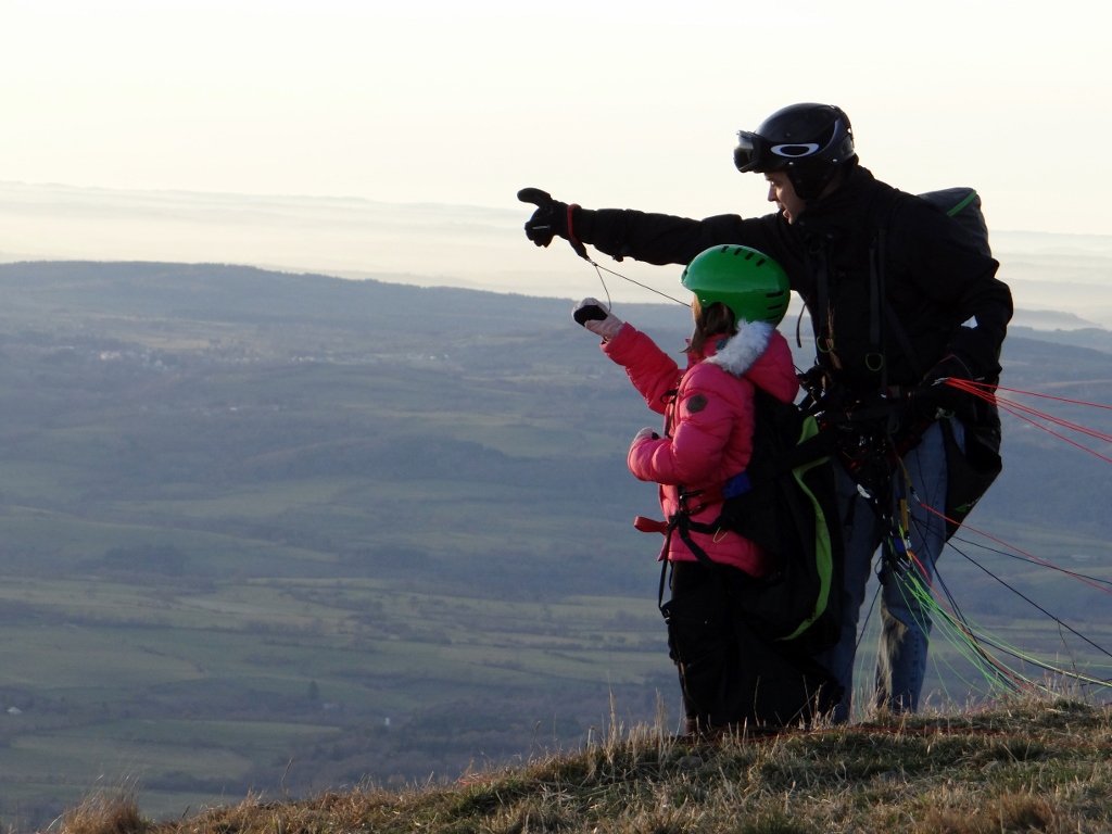 Train tickets bought (Charlie’s was €3.30, Jay and I were €6 each, but it was worth every cent) and we could relax and wander around the broad summit area. Information boards told of the history; an ancient temple, the first radio transmissions, the first flight to here from Paris as part of a competition. But it was the views out across the other craters in the chain (there are 80 in total spanning just under 20 miles) and Clermont-Ferrand at our feet that took our attention. That and the non-stop stream of para-punters leaping off the top (see below for all the photos!).