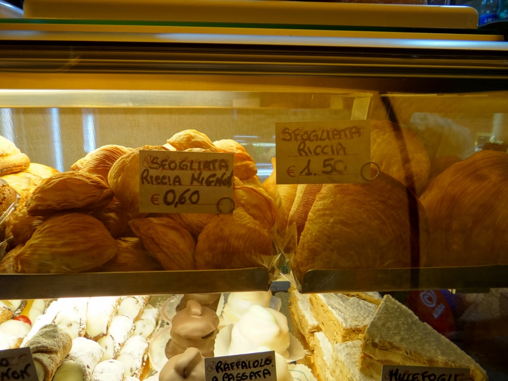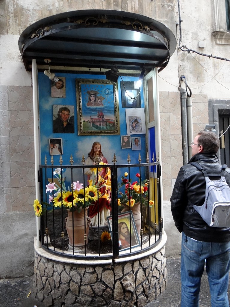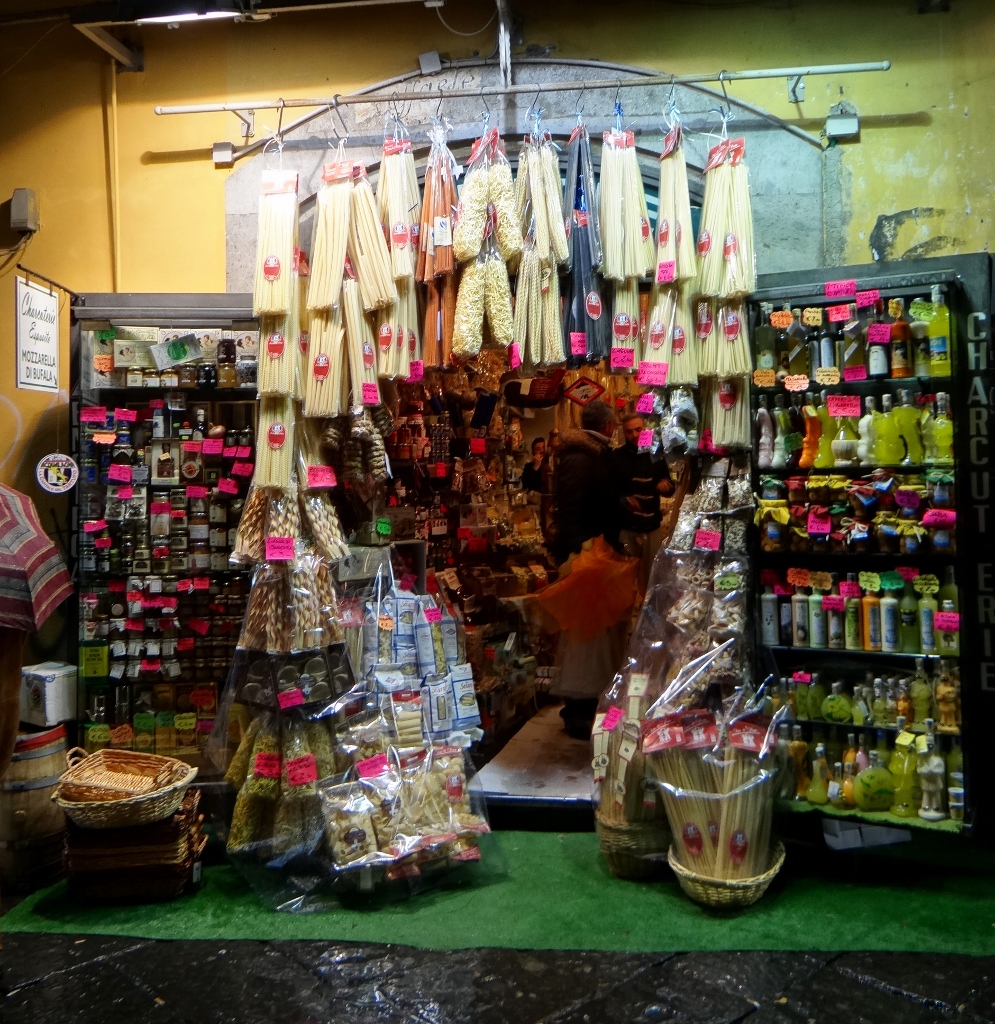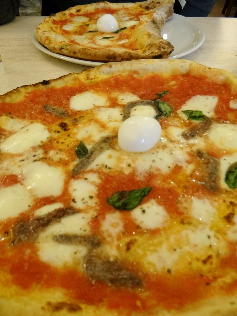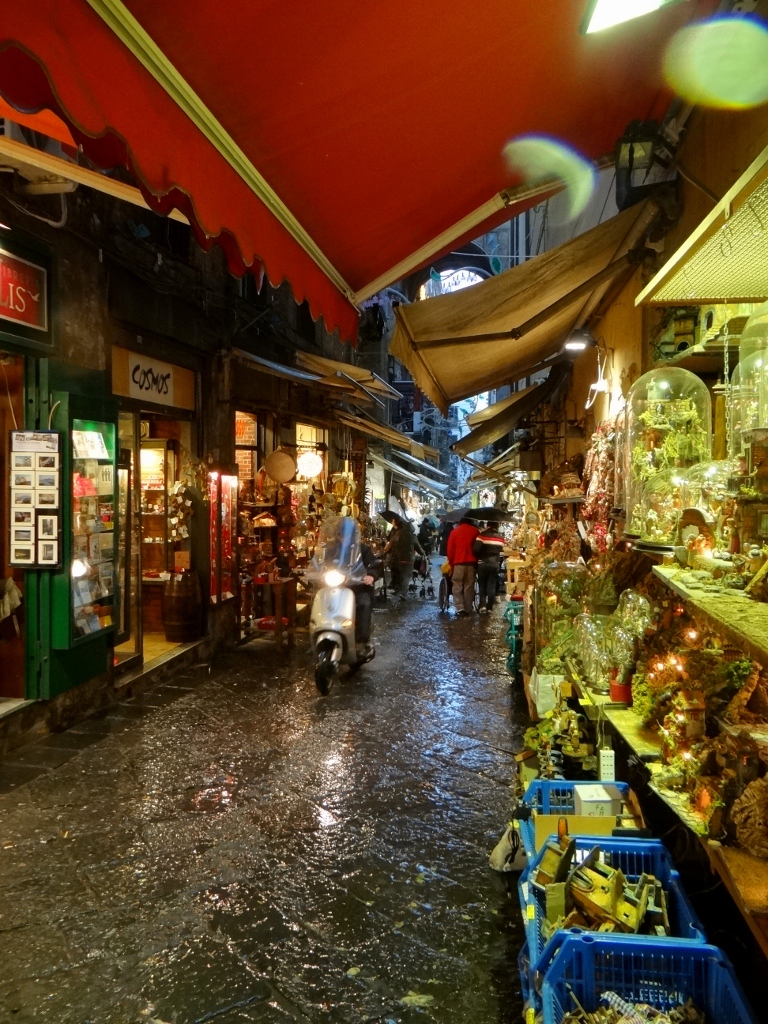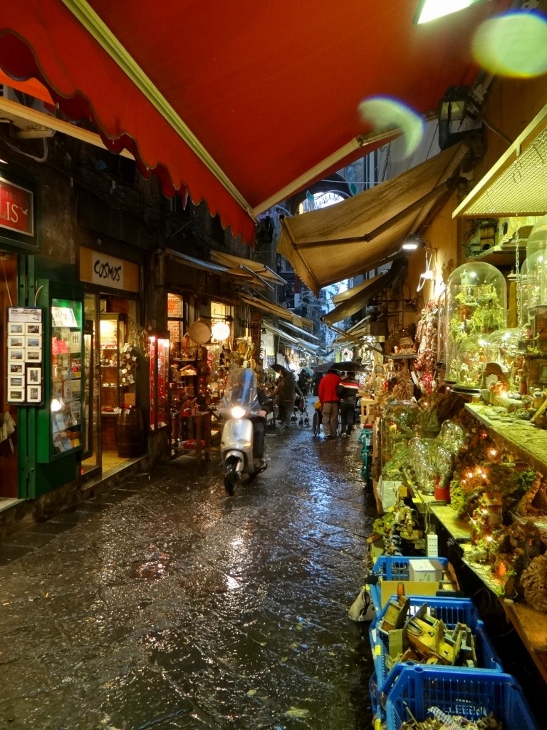 Rivers of rain ran down the narrow streets, in the apartment blocks above plastic sheets were thrown over the washing that hung out over us. More plastic sheets were thrown over goods standing outside as people huddled under any shelter they could find. We took refuge in a pizzeria, after all Naples invented the pizza and it’s said make the best ones in the world. Our menus had over 40 types to choose from – but not one with pineapple! Tucking in I could see what all the fuss is about, mine was thin, crispy and belissimo!