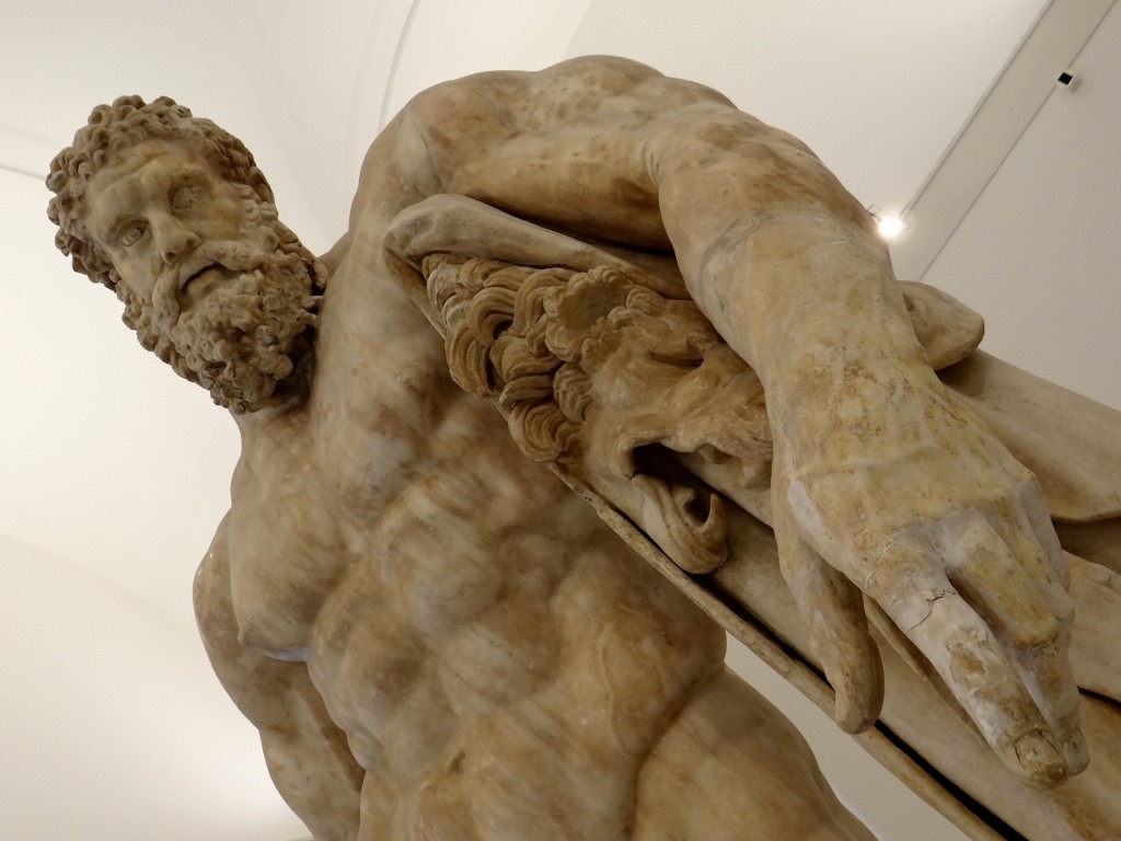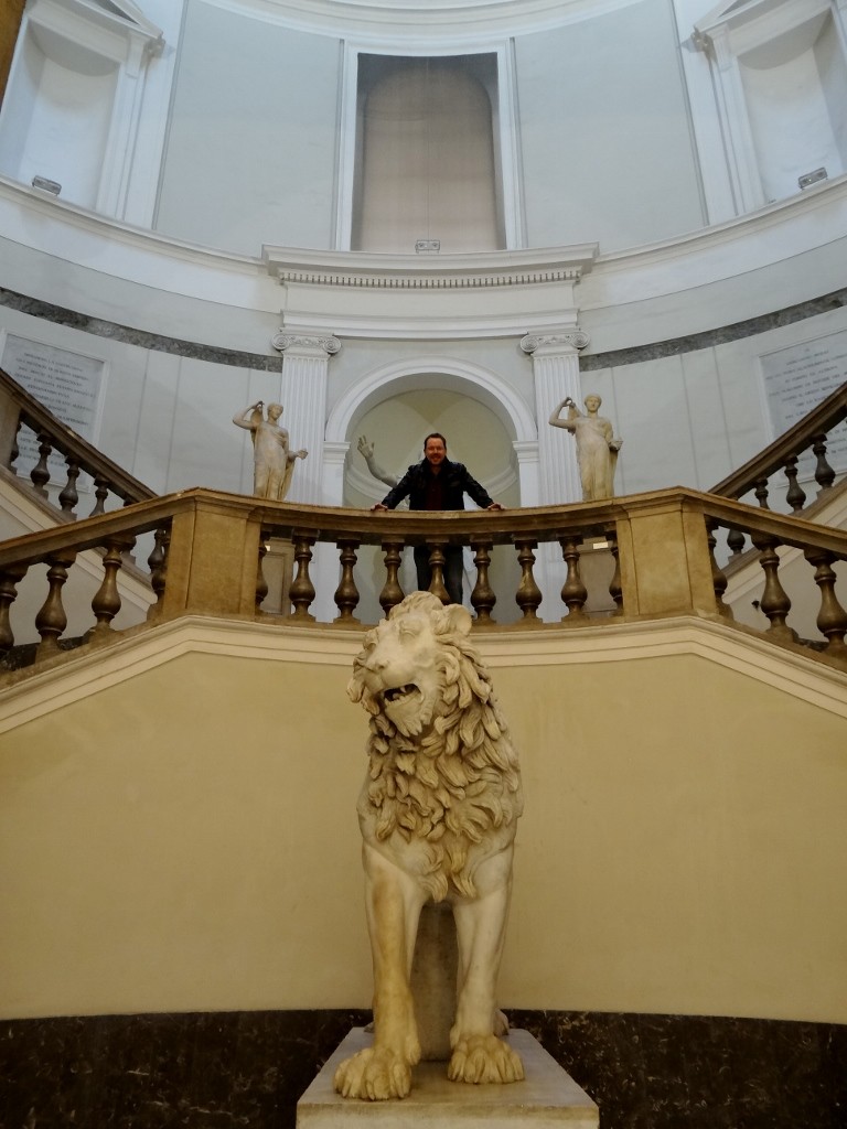The rain got steadily heavier and now having our bearings we made for the Museo Nazionale, the home to most of the stuff taken from Pompeii and Herculanium. A quick stop for a Pizza Fritta for Jay (a Naples speciality – deep fried pizza) and we took cover from the rain for a couple of hours in the museum. As we wandered around it was very clear why everything couldn’t be left in situ at the sites, there was tonnes of stuff. Huge statues, painted frescos the size of a wall, massive mosaics made up of tiny pixel-like pieces, pots, pans and even glass-wear (which struggles to survive in Dave, so how it made it through the volcano is beyond me). Having missed the naughty frescoes at the Pompeii site due to the baths being closed, we were pleased to see a ‘secret cabinet’ area of the museum was open, to those over 14 years of age who promise not to giggle! It was quite refreshing to see just how open the Romans were about all things naughty, in fact there were male bits were all over the ruins as they saw them as a sign of good fortune.