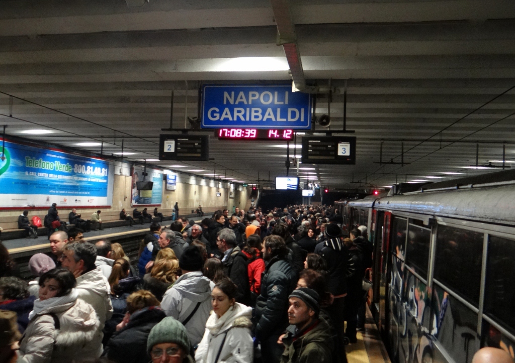 Five minutes later a train slowly pulled into our platform, the front carriages empty, the back carriage was unlit, a few of its doors were half open as it was absolutely packed full. Steaming (literally) crowds spilled onto the platform, expressing their unhappiness at whatever had happened to them. I heard a voice speaking English and edged my way through the crowd towards it. A couple from Texas were trying to get the train to Sorrento, which is on the same line as our stop, an Italian was translating the announcements for them. A train would arrive at the next platform and we all had to get on, that was everyone already on the platform plus the ones who had just arrived on the other train.