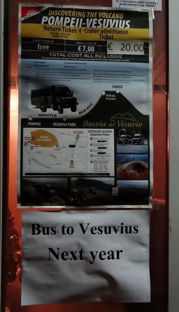 Sardines have more room in their cans, people squared up to each other complaining about taking up too much space or stopping the doors shutting, others joked at the situation. Our favourite person to watch was the man in the middle of our carriage trying to eat a Pizza Fritta but barely able to lift his arm to his mouth – luckily the sheer volume of people held him upright as the train rattled along. So it would seem our transport luck ran out, but we had been warned – a printed out permanent looking sign was stuck to the glass in Pompeii’s ticket office window stating that for unknown reasons the trains may be delayed or not run at all, seems it’s the Italian way!