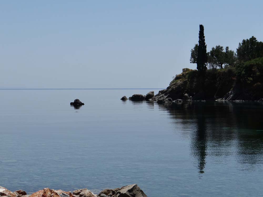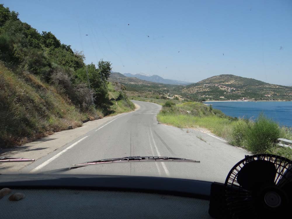 If you come this way and decide to pop down to Kamares (which I’d strongly recommend if you fancy a night or two in a free, peaceful, sea-side spot) then unless you’ve a satnav you might have the same fun as us. The village wasn’t signed, where there are signs they’re all in Greek, and the road’s a concrete one-laner hugged by leaning olive trees. It was worth all the ‘err’ and ‘is this it?’ and ‘it can’t be, can it’? ponderings as we rumbled along. It was also worth the bathroom cabinet door falling off with all the bounding about, one of the mirrored cupboards ones, since we’re jammy swines and it didn’t break.