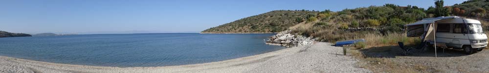 The beach at Kamares, motorhome heaven. Behind us the Taygetos mountains rise like the Alps, still hosting snow in early May.