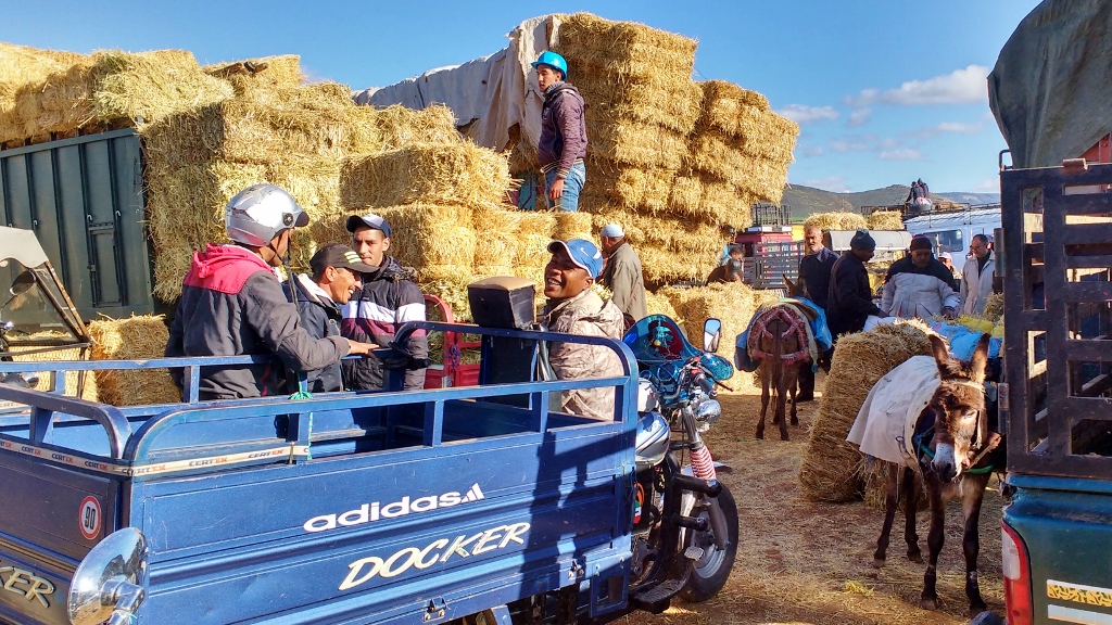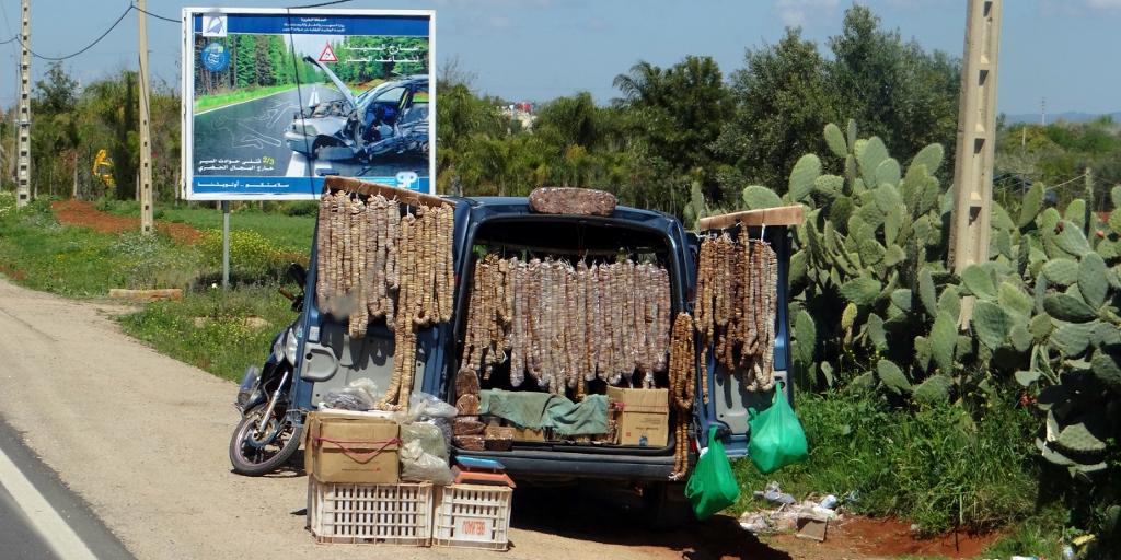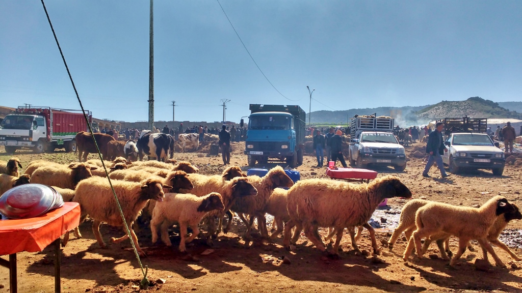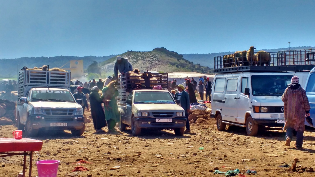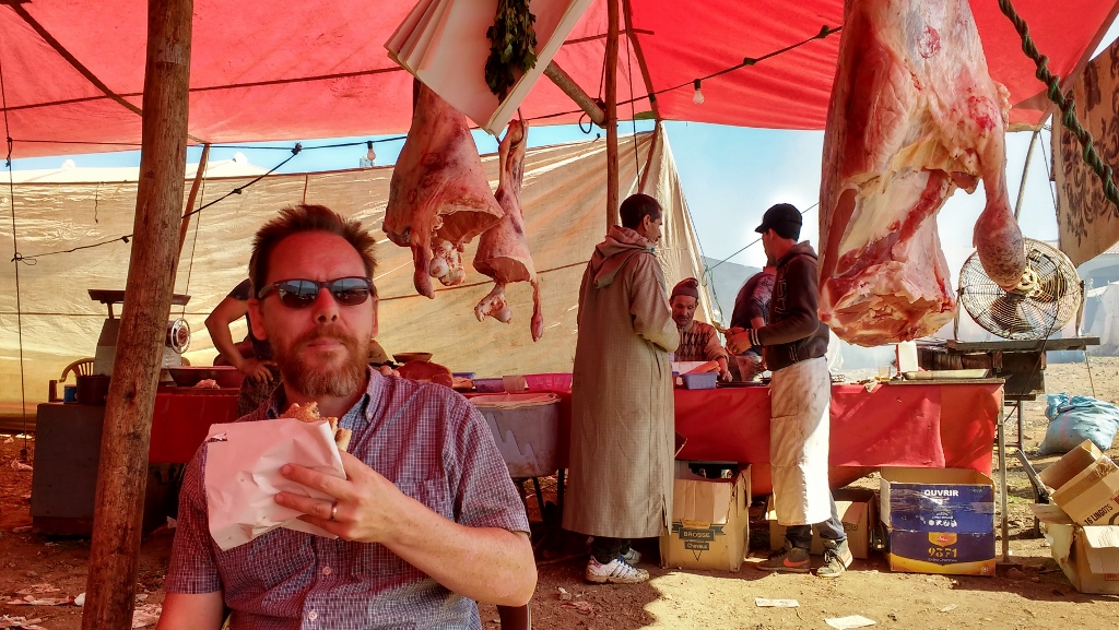 We ordered a beef sandwich each and a pot of tea between us, and while the tea brewed I sat and watched the meat cut off the bone. It was then mixed with onion, spices and a little bit of fat and put through a mincer. The mince was then made into small balls which were cooked on the BBQ and several of them served in a large piece of bread. This all took place right in front of me, while to my right several cows stood tied to a lamp post and flocks of sheep either walked by or were lifted up and loaded onto the roofs of vans. I hate to say it, but it was the best (and undoubtedly freshest) burger I have ever had. After watching the animal market for about half an hour, we paid up (10Dh, €1, for the pot of tea, and 10Dh each for the burgers) and picked our way back through the remaining livestock to our vans. The most unusual thing about the whole souk experience, was that the food stall experience didn’t feel all that unusual, and probably not as weird as it sounds reading it at home.
