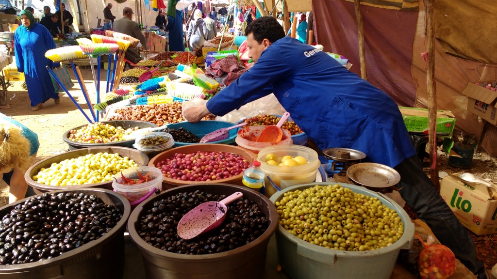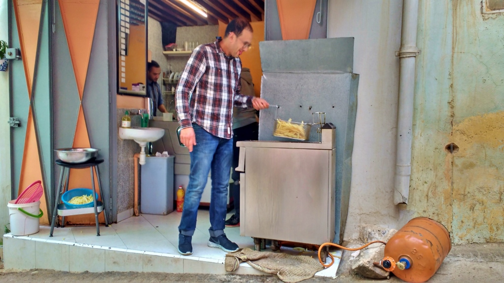 After cycling in I couldn’t resist the smell of chips wafting from this deep fat fryer (run off the gas bottle) in an alleyway in Azrou, so we dived in for tea.After a couple of days in Azrou, a cycle into the town and a meal out in an alleyway, we left the campsite on Tuesday morning and headed for the town’s huge souk. This was a treat which I missed on our visit in January because I was poorly. I have to admit, I wasn’t fussed about going, but I am so glad I did. We found a place on a bit of wasteland to park up the vans and followed the smell of animals.