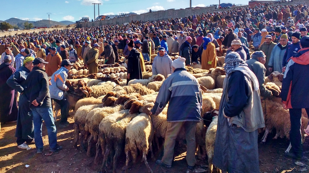 Walking past numerous vans with roof-mounted cages, and through the archway that marked the start of the souk, and the scene that hit me was unlike anything I had ever seen before. A vast sloping field full of men, each of them surrounded by a ‘clump’ of sheep tied together at the heads. The clumps varied in size from single sheep to tens, all packed together looking disfigured, as their heads looked to be facing the wrong way.