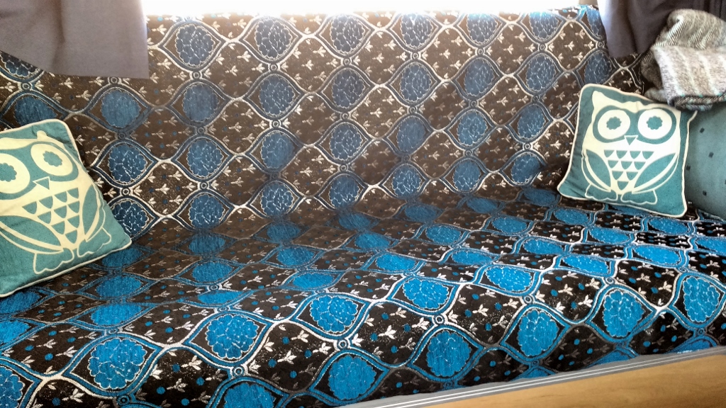 The new bling fabric and the owl cushions it will one day cover, it cost us 80Dh a metre (€8)