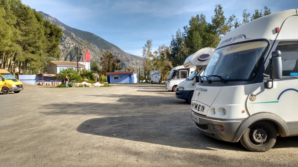 Zagan the motorhome is following in the tyre tracks of our previous motorhome Dave, parked up at Camping Azilan, the only campsite in the ‘blue city’ of Chefchaouen (N35.175603, W5.267009) Morocco. This is our last stop before we head to the ferry back to Europe, so we’re staying here for a few days to make the most of it. It costs 110Dh a night for the two of us to stay here with electricity, about €11.