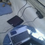 It’s lovely sunshine, but cold at night. Forgot to tell you that I was woken by a thud the other night, looked down from the bed to see Charlie’s sleeping bag on the floor of the van – it’s normally on the side sofa. Couldn’t see him anywhere so went to investigate, he was still tucked up inside. For a few moments I thought he might be dead as he wasn’t moving, but turned out he was fast asleep and must have slept through the whole thing.