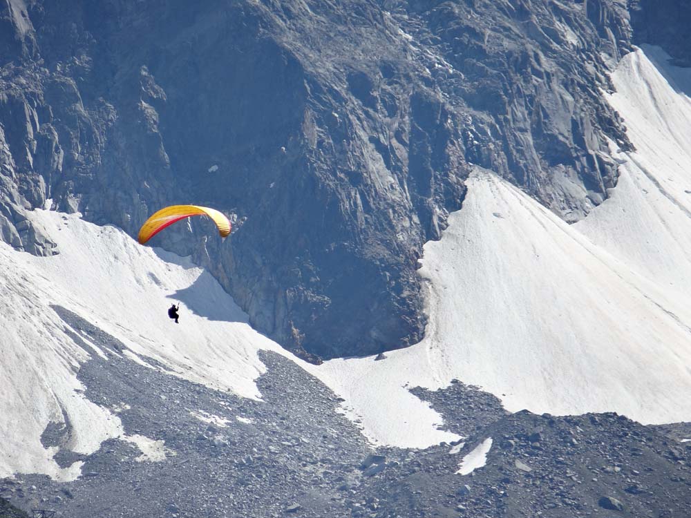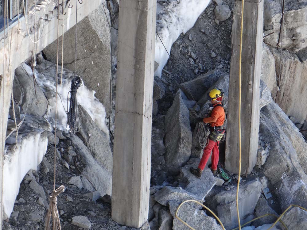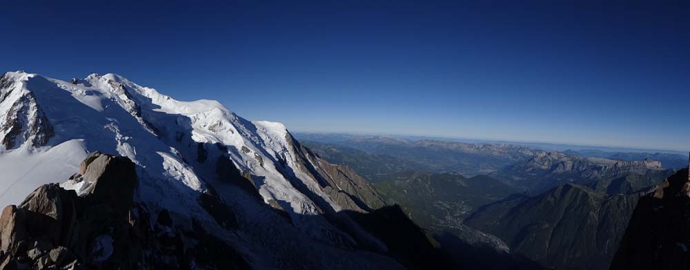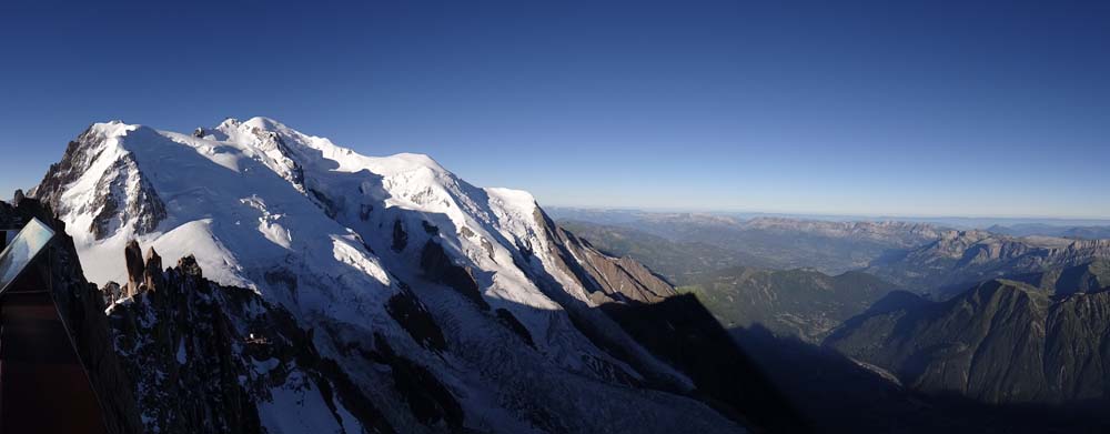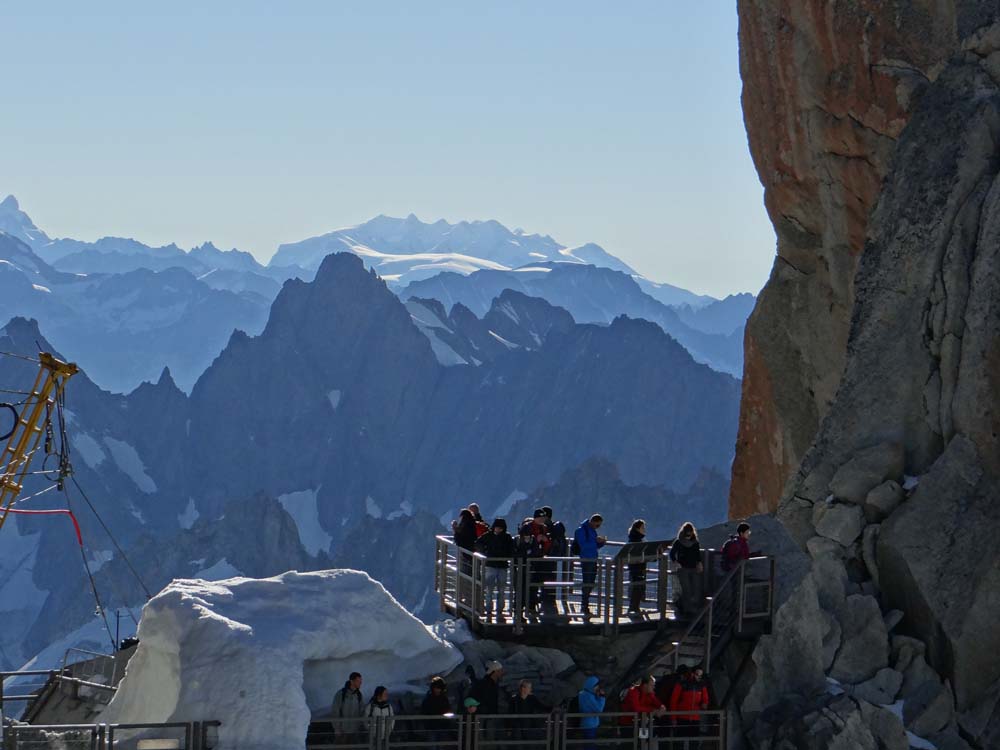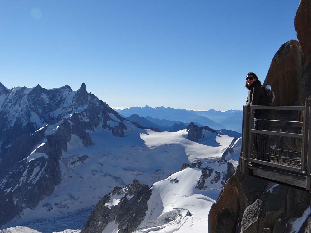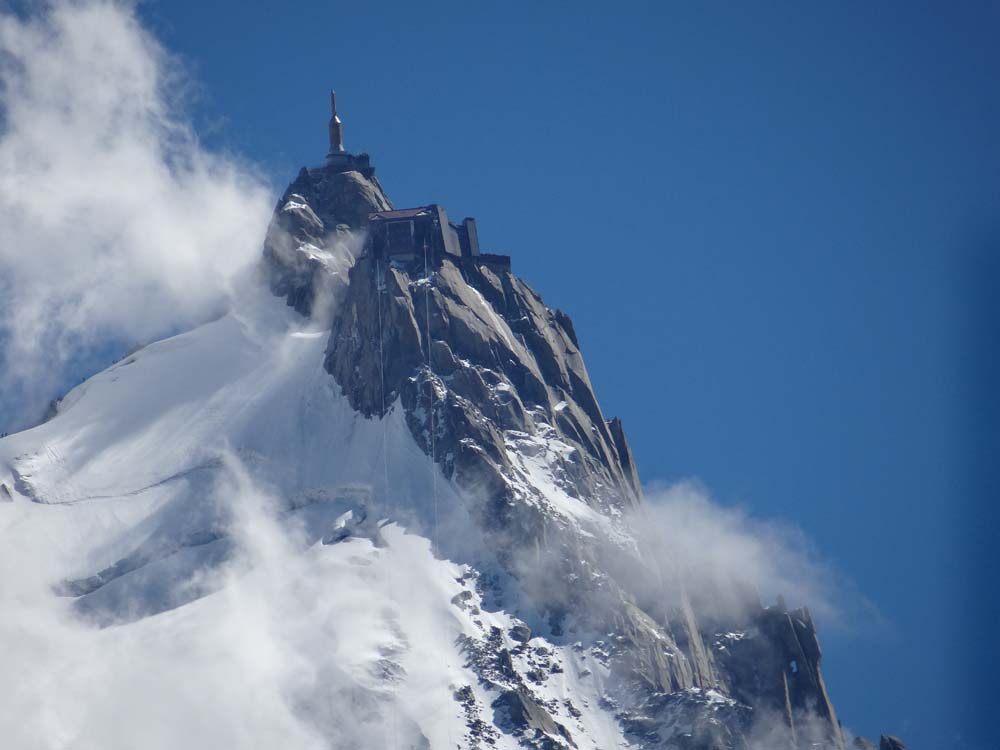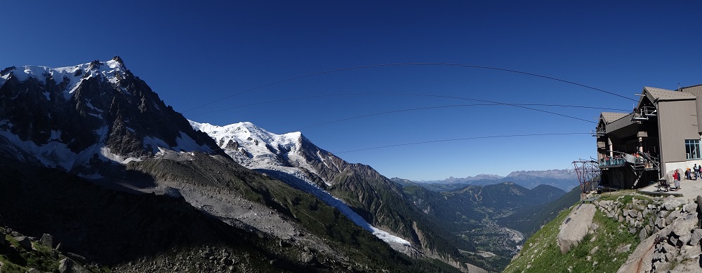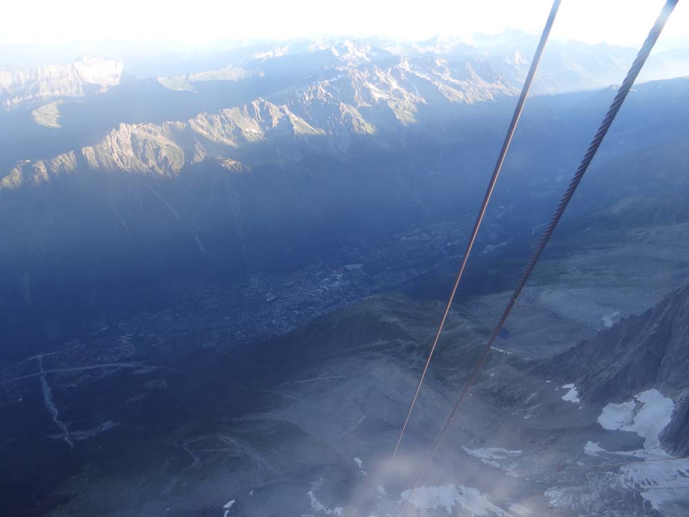 We marvelled at the climbers for a while, and then entertained ourselves wandering around the station and its array of platforms. Over to Mont Blanc in one direction, back over France, over Italy and Switzerland, jagged granite hacks at the pure blue above. Chamonix’s hotels, chalets and villas tumbled about below, miniature grey dice, far too small to make out much else but building outlines and tennis courts. Umpteen glaciers poured down the monumental creases in the rock, paused in time to our eyes; they must appear to be flowing like a viscous liquid to the millions-year old massif to which they freeze.