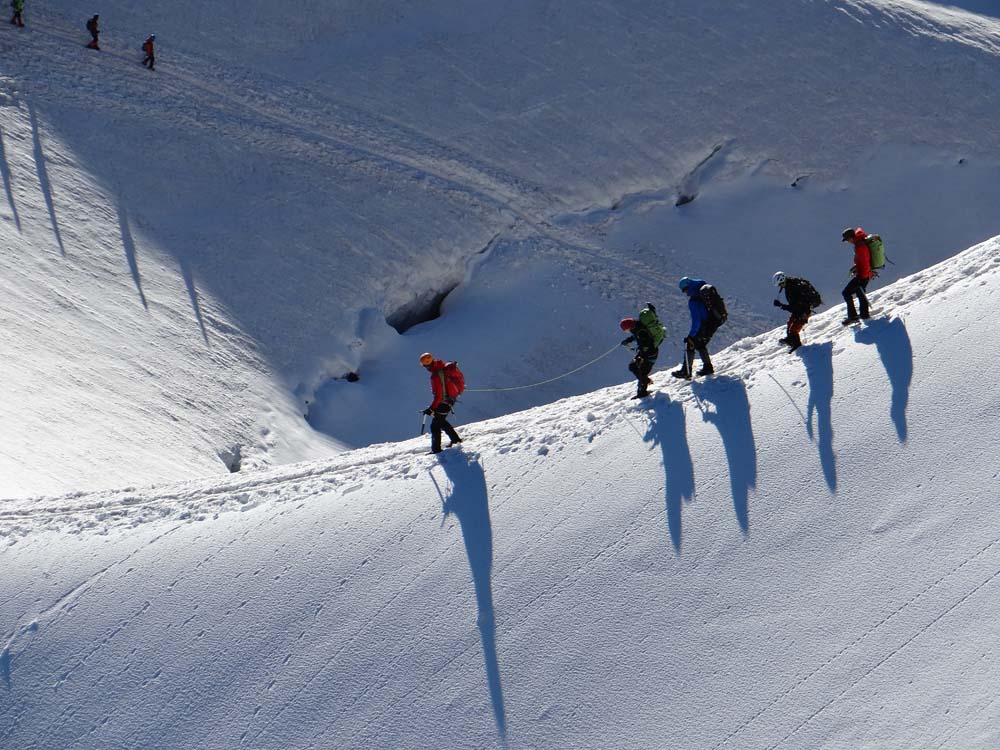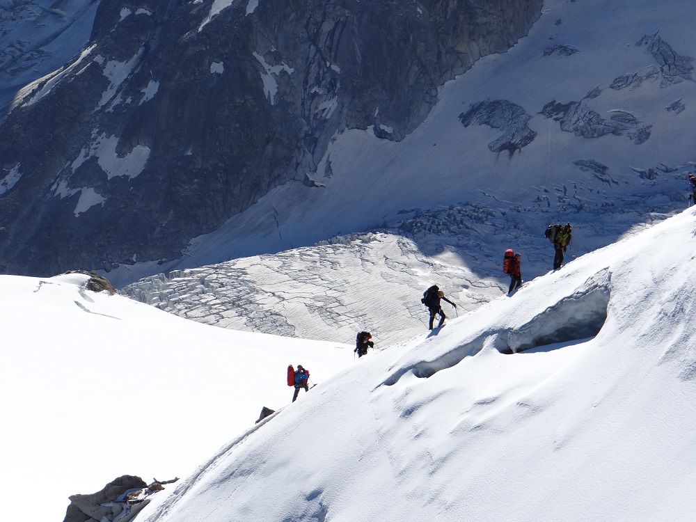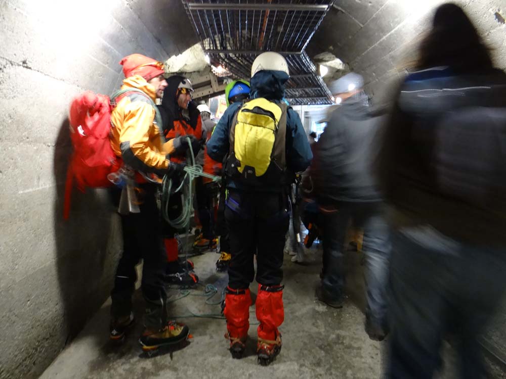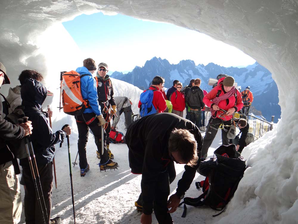 Finding an ice tunnel where all the climbers were headed, we headed there too. And here ends any thoughts of my climbing anything. A small metal gate marks the end of safety, leading to a steep ice ridge down which crampon-spiked boots were trudging in groups. Either side of the ridge were, erm, not good things. If you fell even a foot from the gate, you’d be trying to self-arrest with your ice axe immediately and failing that, it’s curtains I guess. As a total novice you can pay about €2000 for a week’s climbing course here and make a summit attempt at the end. I’ve not got €2000 on me, but if I had, nope, I’d not be going out there with it. It’s a pretty safe summit by some accounts. A plane’s landed on it. They once carried a hot tub to the top. 20,000 people a year climb it. On the other hand, it kills tens of climbers a year with snow and rock avalanches, crevasse falls, and other nasty but sudden endings. On a lighter note, there’s a bit of a comedy spat over the Italian-French border which, on French maps has a little kink to place all of the summit in France, but on Italian maps it cuts straight over the summit, so the mountain’s peak sits in both countries…
