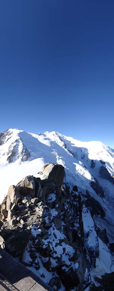 The cable car takes two huge leaps to get atop of the needle, stopping at the Plan de l’Aiguille before a second cabin makes an unsupported smooth slide up a vertical cliff face to the upper station. We’d read you could buy a ticket to the mid-station to save a few Lidl beers, but you’d be robbing yourself, and whoever tapped out those words is correct, if you come, head for the top. We saw the sunrise about half way up, then walked out of the cabin and within maybe 2 minutes I’d nearly passed out.