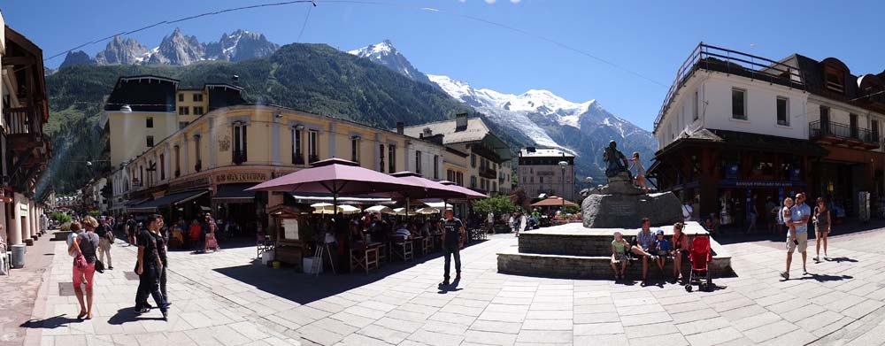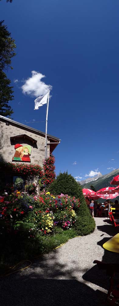 The cafe (Chalet La Floria) was a lovely spot though, plastered with multi-coloured flowers, and with a panoramic view of the massif. Oh, and a dry-loo which had poor old Ju heaving and swatting flies! I held out for Dave’s luxury at hearing of this. Walking back through the town, we craned our necks up at the para gliders hanging in mid-air in clusters.