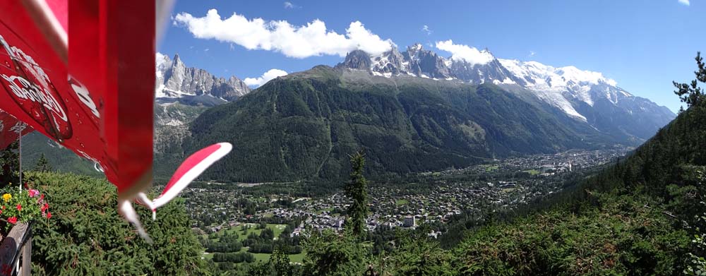 As we released a sleepy Charlie from Dave, we spotted Mandy who told us Todd had left at 7am on his marathon bike ride. What a hero. Mandy described a walk we could do with Charlie, up the north side of the valley for an hour to a cafe, and then headed off to their friends. We snoozed, but did make it out for the walk up, which just about killed us. Everyone, without exception, in Chamonix is as fit as a fiddle. We struggled up the 1 in 3 path, dragging our feet and moaning at the world, as people passed us pushing nippers in chairs or carrying them on their backs. Clearly we need walking sticks, those that look like ski poles, as they seemed to make elderly folks twice as fast as us!