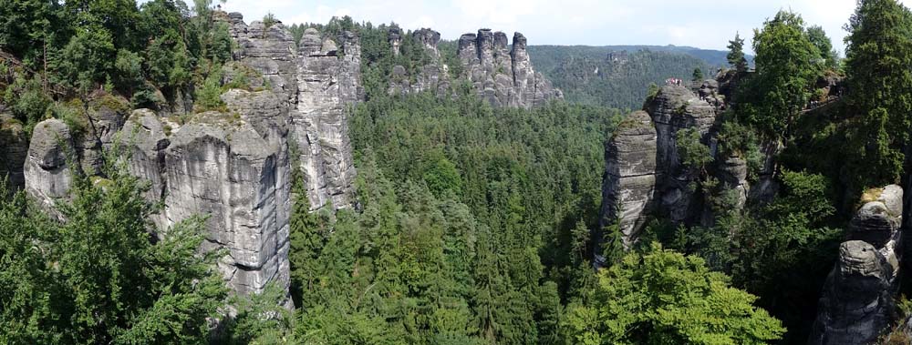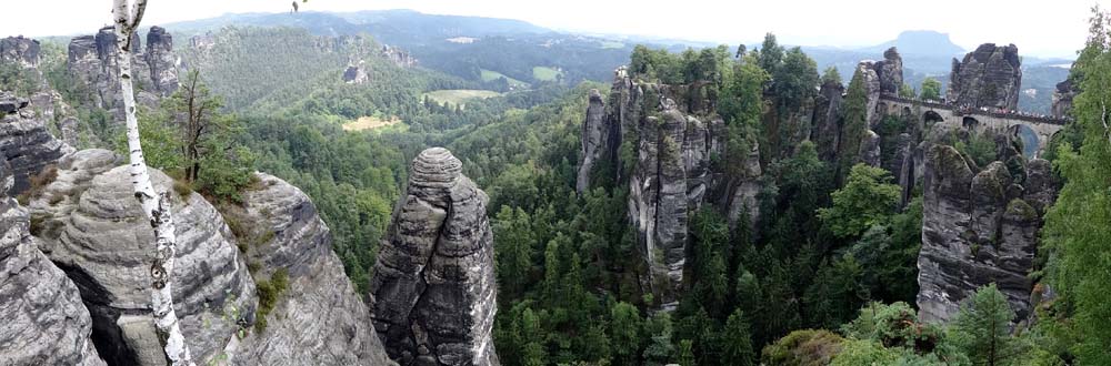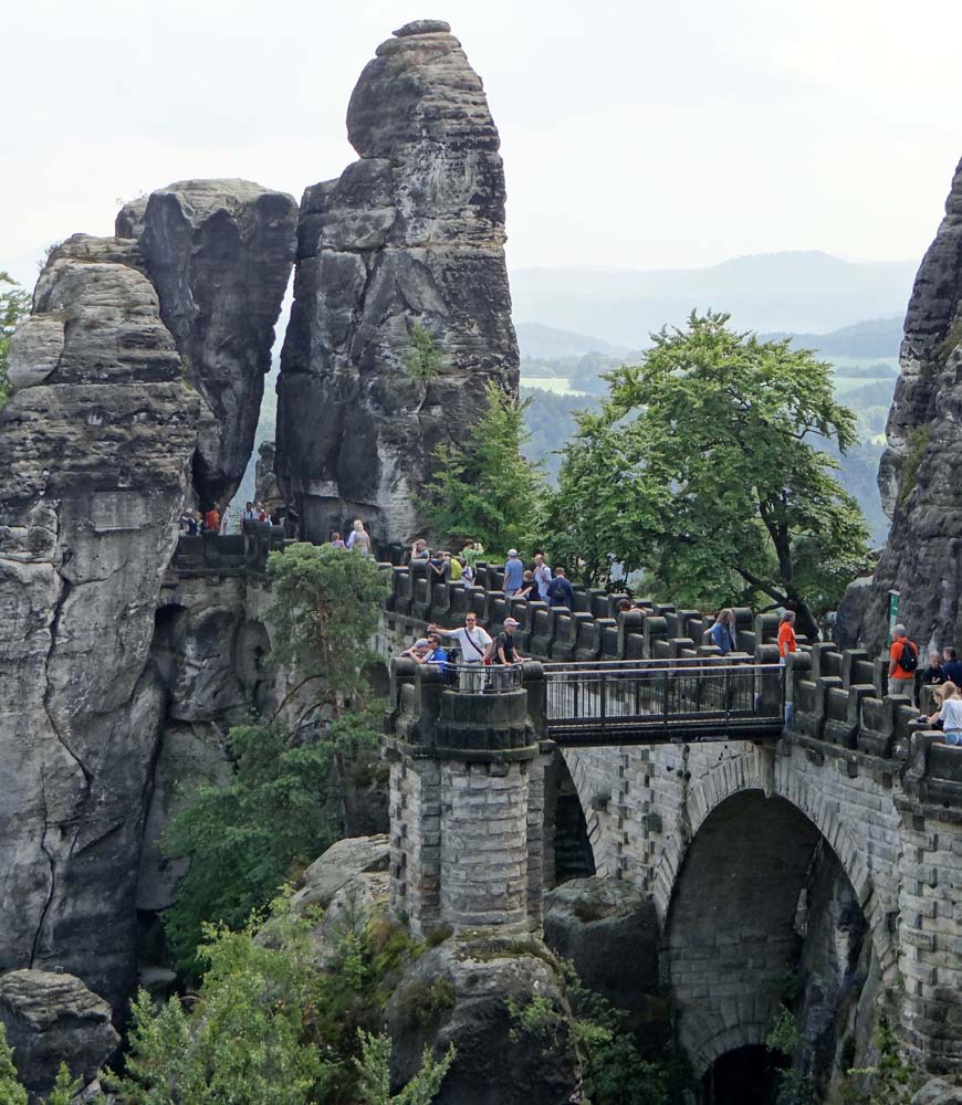 It’s not just the spectacular views that have got this place on the UNESCO world heritage list, there also used to be a wooden fortress here in the 13th Century. You can pay an extra €1.50 each to walk along a series of footbridges linking the crags on which the castle was built, but the remains of the castle are so few and the views just as spectacular elsewhere from free viewpoints – oh and Charlie’s whimpering would have gone up an octave – we didn’t bother. Instead we wandered a couple of times over the Basteibrücke (Bastei Bridge) which used to be made of wood so that when the fortress was under attack it could be torn down. Thankfully it’s now made of stone or we would never have got Charlie over it.