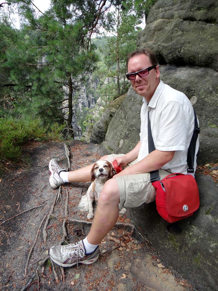 We followed the throng of people and found ourselves at another viewpoint, this one even more impressive than the last as it had sheer cliffs on three sides. It looked out over the River Elbe and the expanse of flat land which made where we were stood seem even more special. Of course Charlie doesn’t do heights, so we took it in turns to admire the view while he whimpered non-stop like a cricket at dusk. People stopped and cooed at him, ‘Ihr haben angst’ (he is afraid) I would tell them, they would smile, laugh and coo some more, and that is pretty much how the rest of our walk around the place went.