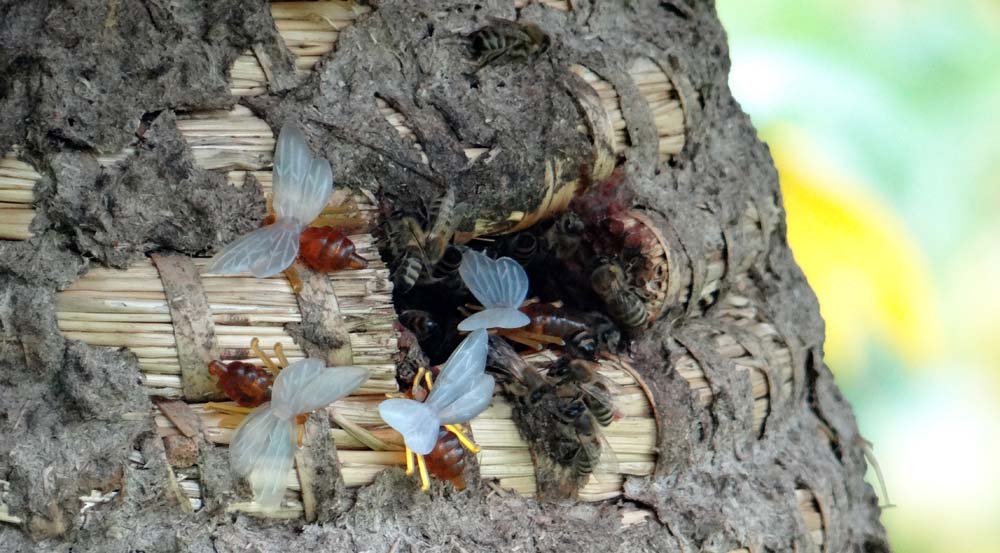Bees emerging from a traditional hive after the rain (suspect the fake bees are to show them the way in and out)