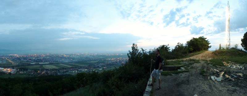 The walk to the hill top took us over a huge motorcross track, open and free for anyone to use. As we scrambled up the steep jumps we speculated on where the riders would go, surely if they were finishing just the other side of the trees, then they’ll be using the motorcross track too? At the viewpoint, an electric spark cracked rhythmically and the cross lit up. Below us Sibiu, shrouded in mist, also lit up as the street lights came on. In the distance the Carpathian hills had clouds hanging below their peaks.