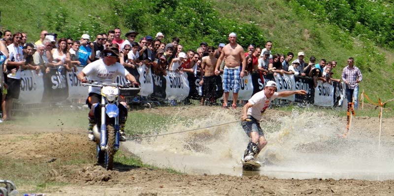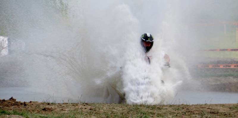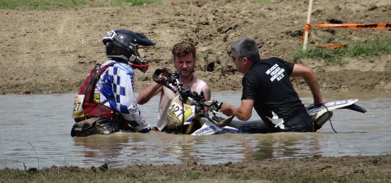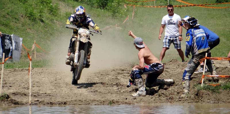 Once over the ‘finish line?!’ the riders disappeared off into the trees again and we could see glimpses of them now and again tackling smaller, equally vertical sections until they were in the main arena, where the riders had a choice – the ‘chicken line’ which was to simply ride over the line, or to try and cross the water. As the first person to rise to the challenge lined up the crowd were on their feet. They got to witness a spectacular somersault finish in the water, with rider and bike both getting submerged. A crew jumps in and feels around to help retrieve the bike and help carry it to the finish as there is no hope of it starting again. Funnily enough few people attempted the water jump after that, but the pro-riders who did make it across came and stood by the start of it and coached the local guys as they attempted to cross the pond.