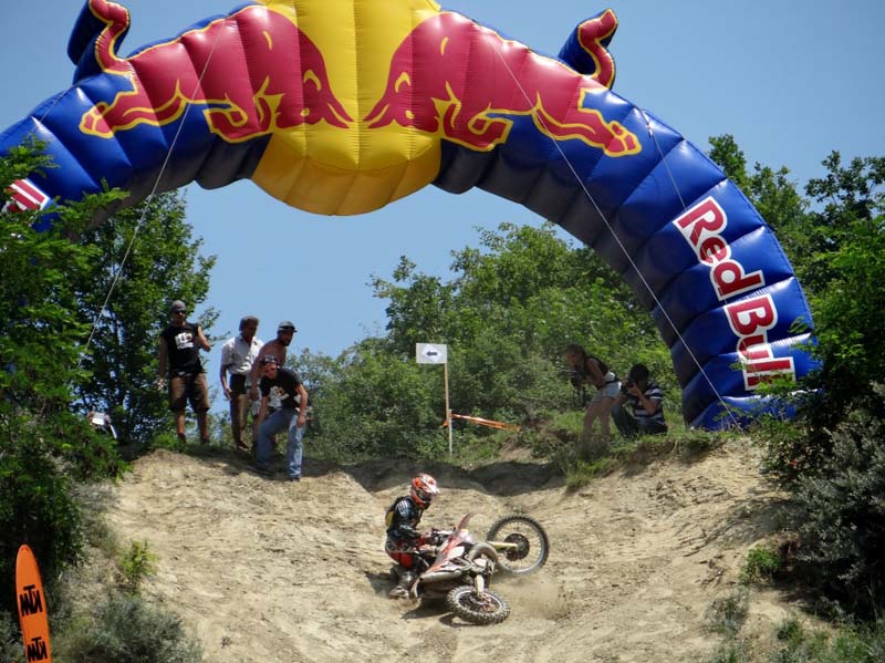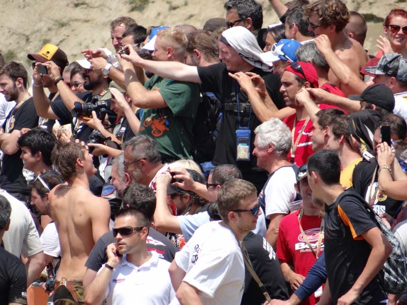 Ducking under some bright orange KTM tape we were inside the natural bowl shaped arena. We climbed a small mound of earth to one side and set up camp on a flat spot right opposite the finishing post. Realising that we weren’t going to get any shade, Jay headed back to Dave and grabbed an umbrella to create our own. By the time he had returned our chairs were surrounded and the place was filling up. The Offspring, The Sex Pistols and numerous other angry sounding tunes blared out from the speakers set either side of the Red Bull branded Hummer that the DJ sat on.