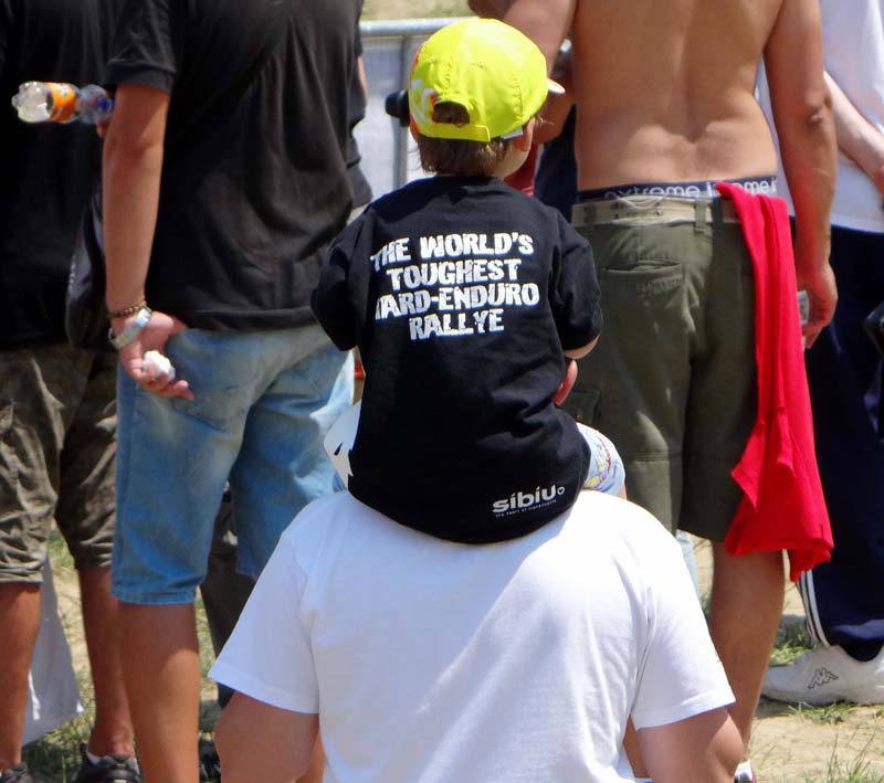 The announcer thankfully used both English and Romanian to tell everyone what was happening. There was so much going on we didn’t know where to look. Someone attempting the steep finish climb (unsuccessfully), a JCB still piling up dirt, banners being hung around the security fencing, armed police with bullet proof jackets wandering around, off-road bikes weaving through the crowds – it kept us entertained until the helicopter arrived and landed in the motorcross field behind us. A signal that the first of the riders was due.