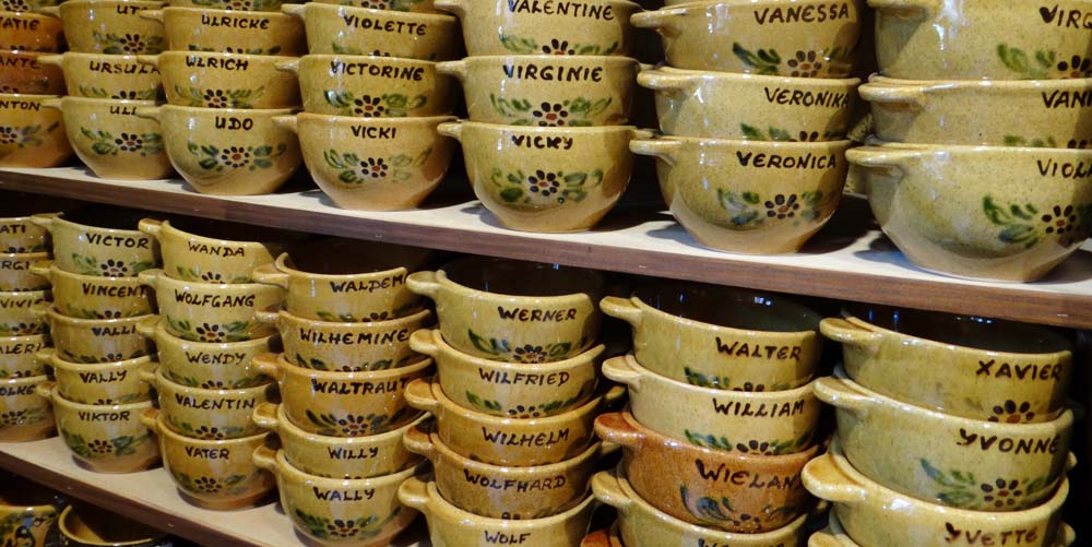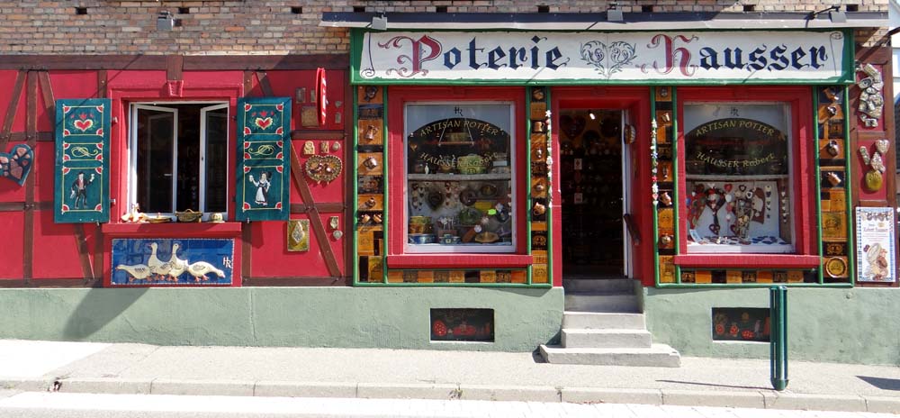 Soufflenheim is famous for pottery, the main street is lined with potters workshops and shops selling the stuff. Each potter seems to have their own style, so luckily the shops aren’t full of all the same thing. I’d been thinking of getting a little jug for wine for months, and should really have bought one in Tunisia, Bulgaria or Romania where it would no doubt have been much cheaper, but I haven’t spotted anything I liked – until now. So we’ve picked up yet another souvenir and another little space in Dave’s already overstuffed cupboards has been filled.