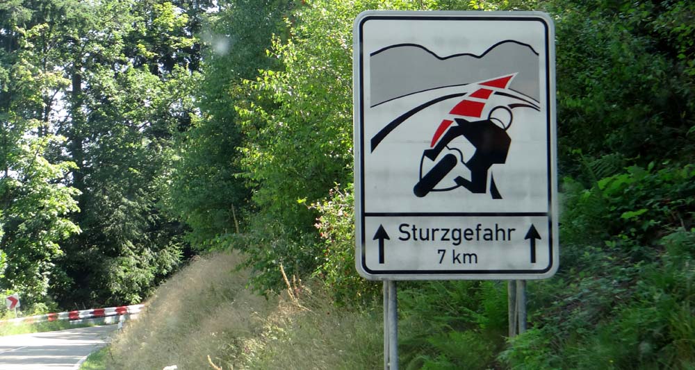 Jay liked this road sign, the ones in the UK show bikers dead or injured and tells them to slow down, here you get instructions on how to get your knee down taking the corner!