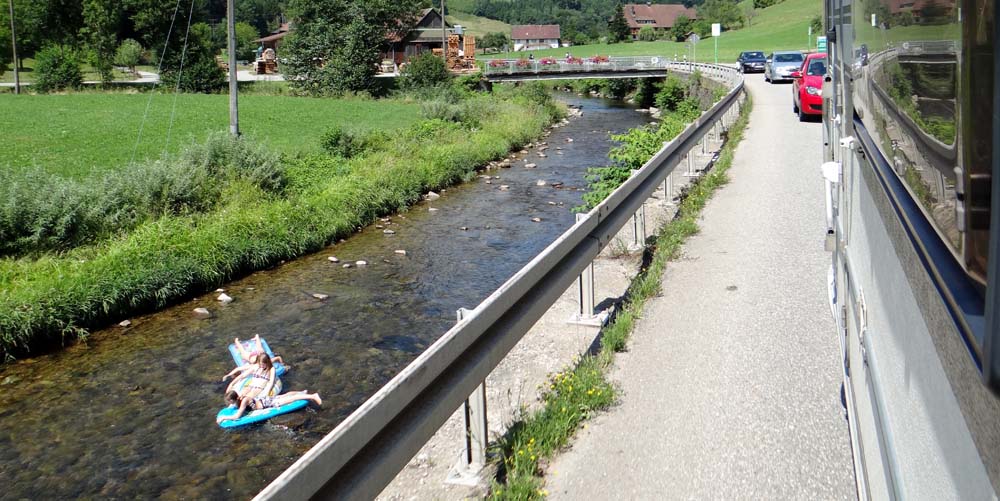 Dave the motorhome is in a rather busy little stellplatz (N48.09023 E7.95834) in the German town of Waldkirch, just north of Freiburg in the Black Forest. We got the last of the designated motorhome spaces when we arrived just after 6pm, but because it’s so hot and the whole car park is covered by trees, arrivals after us are parking in the car spaces – shade is a valuable commodity today.