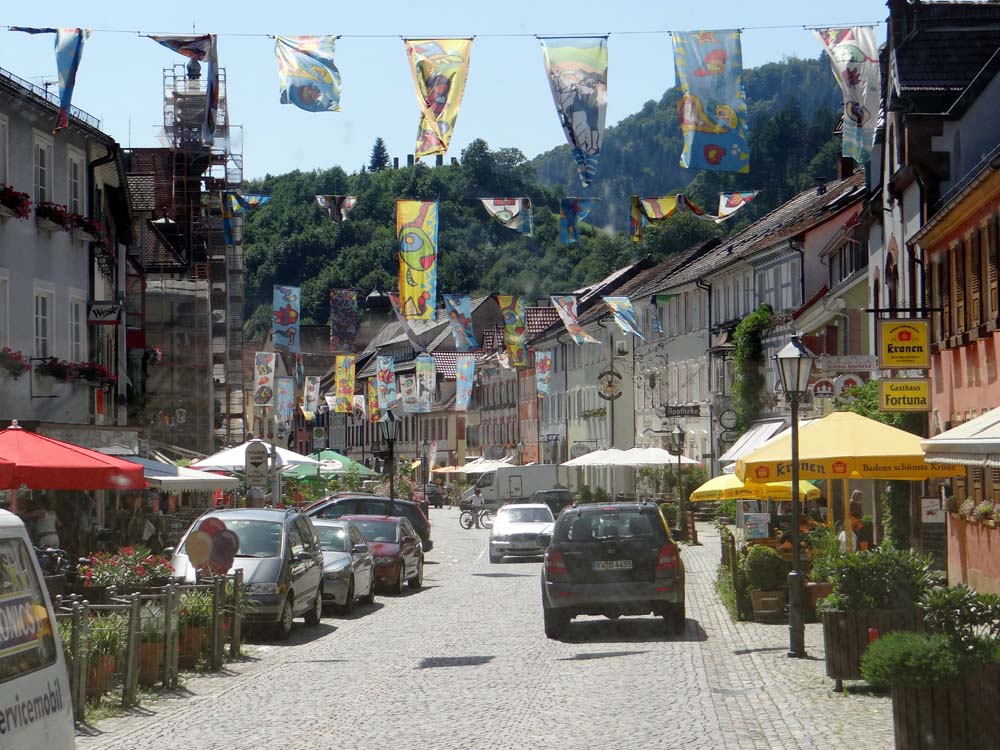 Back at the car park the ticket machine made it clear that the charge for parking was €1.50 an hour, we were just inside two hours so coughed up and cleared out before it ticked over again. This time we set our satnav for Waldkirch as the photos on our database showed a car park with tall trees around it. This time the journey took us through the bits of the Black Forest that we like the best – lush green valleys of grass with chalet style houses and cows in the fields, fringed with the tall dark trees on the hills above.