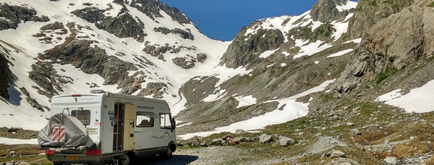 One Czech couple had me intrigued as they pulled on skiing boots, so I wandered over holding a cuppa in a mug big enough they confused it for a bowl of soup! It turned out they were using ‘skins’ on their skis to hike up the snow field below the glacier (which looks almost vertical from here) and ski back down. We spent a good hour watching their tiny dots edging up the mountain, then executing rapid turns on the descent before hiking back up again. I went over afterwards and told them I’m amazed at how fit they must be, which they laughed off, telling me the snow conditions are good, with nice soft layer of snow on top of the hard stuff. There are a few 4x4s with roof tents, and one couple have gone even simpler, just chucking a blow-up mattress alongside their car and kipping under the stars. Looking at this motley lot we’re once again made aware of just how much luxury we have in our home-on-wheels, with our hot shower, TV, double bed, toilet, fridge-freezer, heating, 230V power and always-on Internet connection!