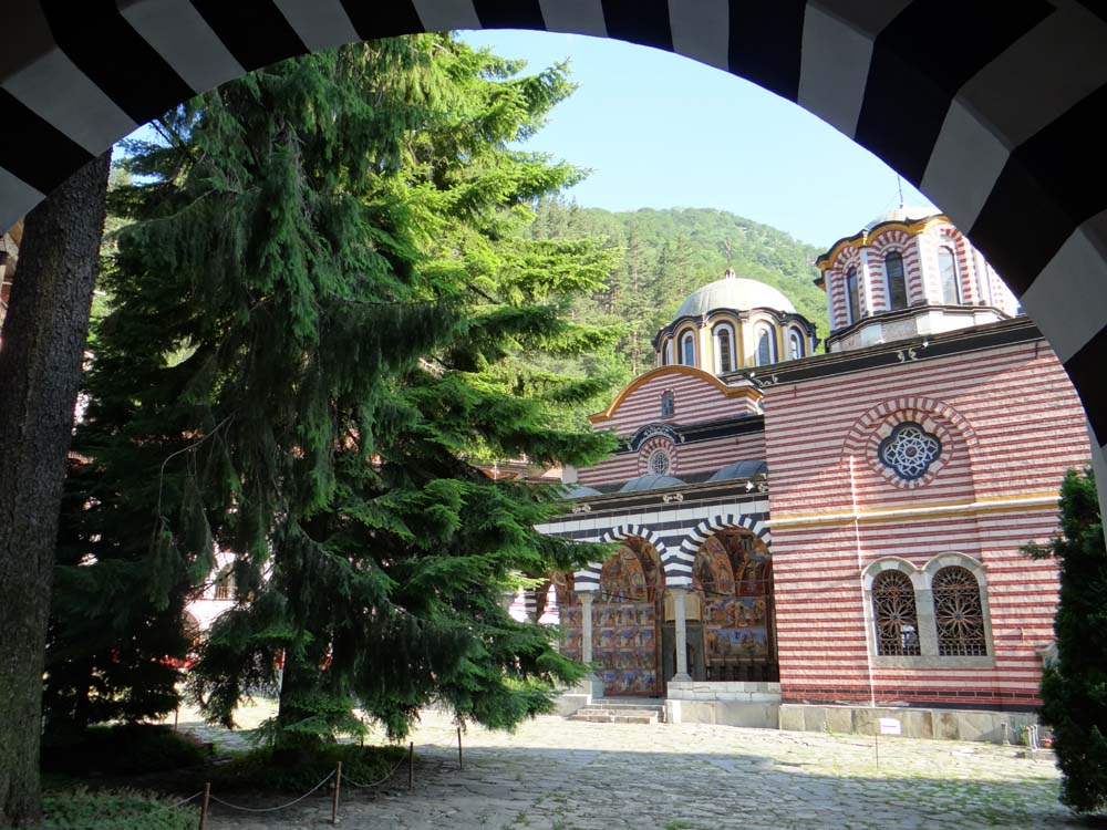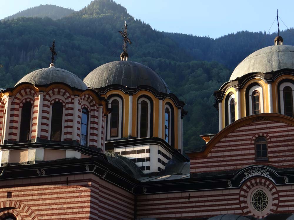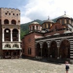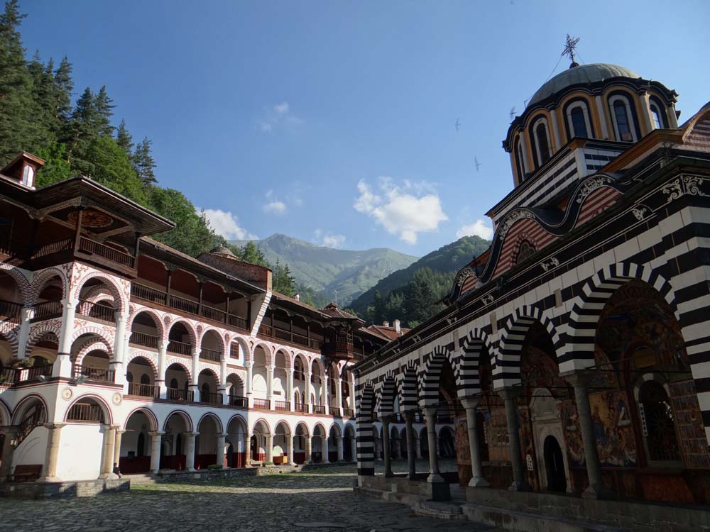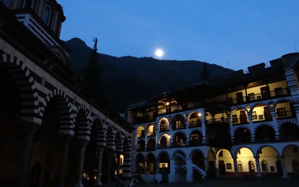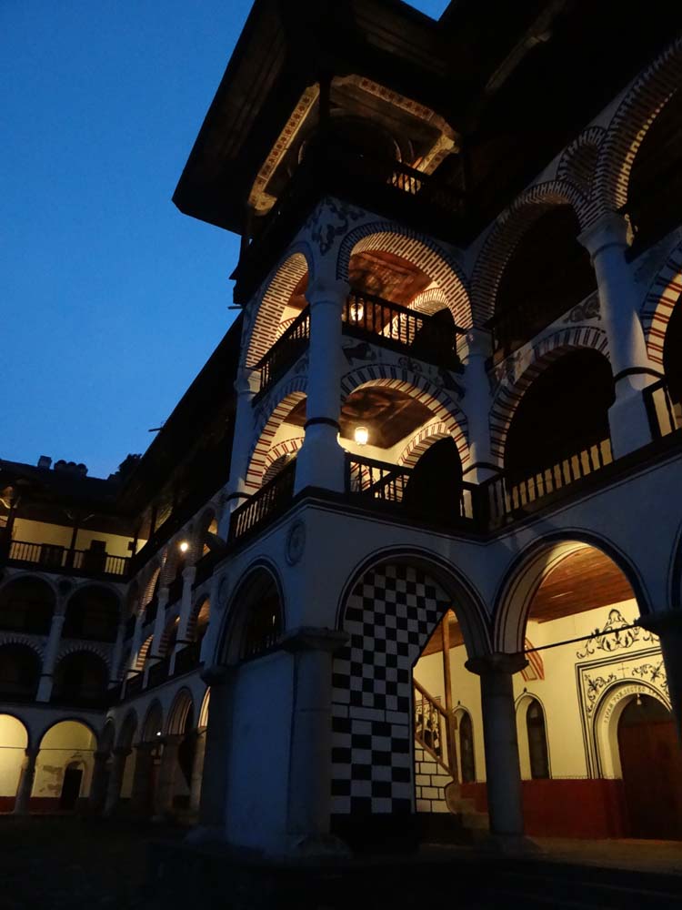 Having a motorhome’s much like being a kid again. That feeling of setting up a tent in the back garden and ‘roughing it’ out in the wild as a nipper, that’s motorhoming that is. At 9:30pm last night the tourists were gone from the Rila Monastery, just a couple of ‘Group 4’-attired security guards remained, chatting with each other, their heads shaved to the skin. We’d already eaten, the act of cooking sausages and mash under the fortress walls of the monastery bringing out the ‘nipper in a tent’ feeling. Ju walked over to the monastery and photographed it some more, this time in the dark, gently lit by the moon and (of course) electric lights. I walked over after her. The monastery draws getting on for a million visitors a year, so is predictably a little hectic in the courtyard. By nightfall it reverts back to what it’s supposed to be, a place of contemplation set high in the woods and mountains, a place where the Bulgarian identity has been guarded in tough times, and there’ve been plenty of them here.