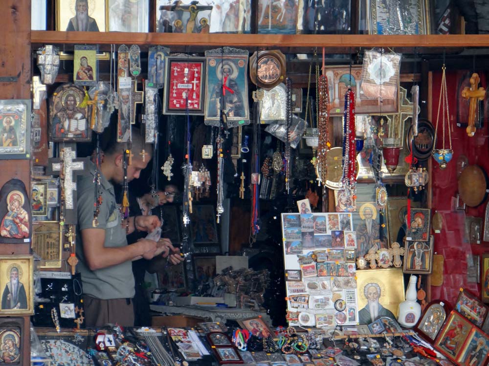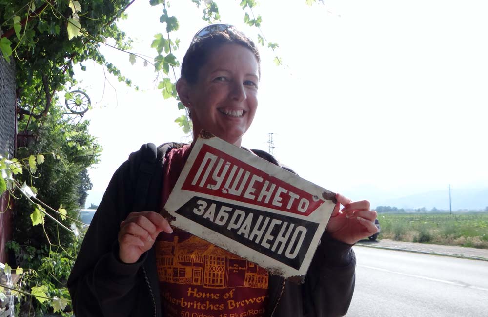 Satiated, Ju spied a stack of old Cyrillic signs. ‘How much?’ we asked the lad, with the universal rubbing of thumb and forefinger. His job was clearly crap-shifting, not dealing with punters. Another guy turned up, worked out what we wanted and shouted for The Boss. The Boss is capitalised as he was (a) smoking a cigarette without actually looking like he was smoking a cigarette, (b) rather large, like an already large man who’d been pumped up to the point folks stuck fingers in ears waiting for the bang and (c) he was bare chested, his belly reaching us a few minutes before the rest of him. Ju showed him the sign ‘what does it say?’. ‘Smoking, ah, No Smoking’. ‘How much?’. He takes the sign from us, his fag dangling from his lips as he turned metal over and sketched out 25 in the dust. 25 Lev is about €13, a bit much for us, we popped it back with the rest, he looked non-plussed and we left. Outside the gate we confabbed: I thought it was worth about 5, Ju guessed at 10, she wanted it though and thought about offering 20? You know what it’s like when you think this is your only chance to get that little something? She went for it and he accepted the offer by taking the note and rubbing it on his sweating cheek, and then his crotch.