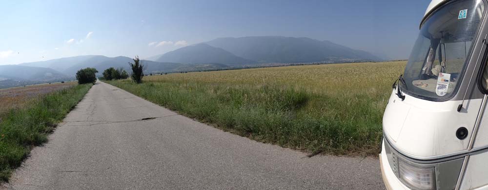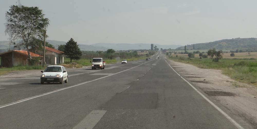 Just after Dupnica we turned east, hugging the edge of the Rila Mountains to our right as we’d been doing all morning. The road went all technicolour dream coat patchy, but suddenly widening into a dual carriageway, to much rejoicing of lorry drivers as they hammered past us.