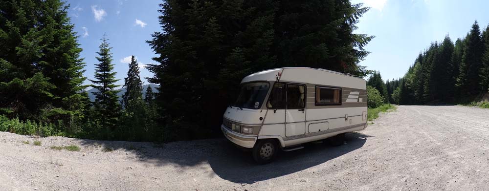Dave the motorhome’s tucked in at base camp, the car park to the Seven Rile Lakes chair lift, 5063 feet above sea level (N42.24274 E23.32441). Arriving here there’s a barrier across the mountain road and a friendly fella took 10 Lev (€5) from us, telling us sure, overnight sleeping is fine. Great news: it meant we’d be able to make our long-awaited attempt at the mountain to try and get to the spot where it’s possible to see all 7 of the Rila National Park Lakes at once. We were fired up to go, our preparation was non-existent and we were armed with T shirts, sandals and a limited supply of humour. See below to find out how we did.
