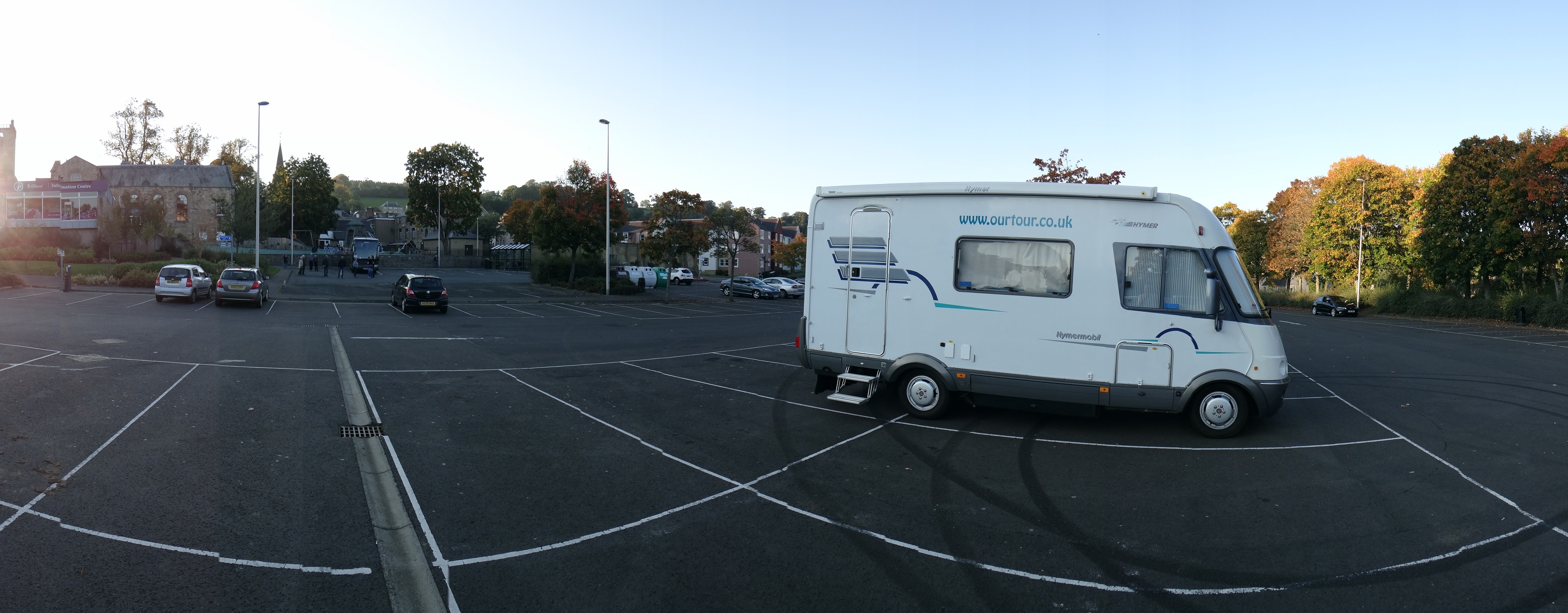 Zagan in the main car park at Jedburgh. Three other motorhomes overnighted here with us. The neds have been here before us carving donuts, but none showed up last night.