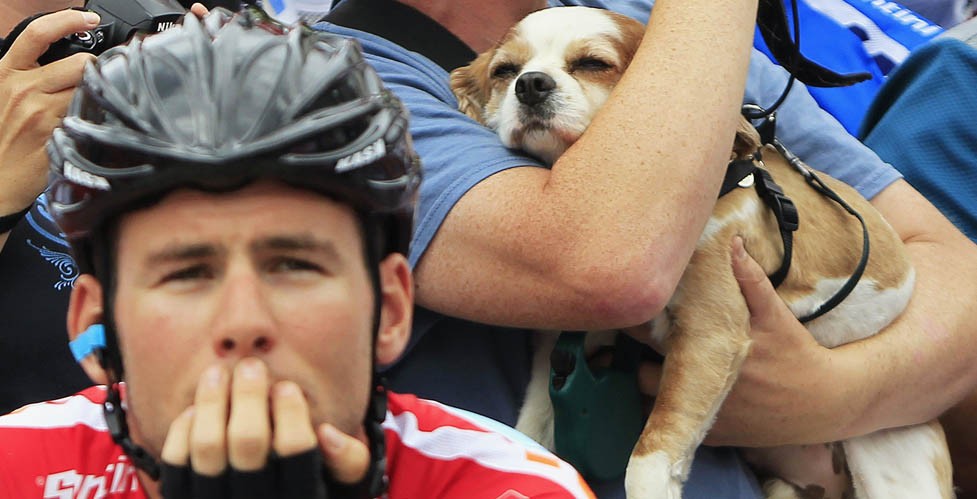 The caption reads – A fan holds his pet dog as Team Sky’s Mark Cavendish of Britain waits for the start of the 149-km Stage 18 of the Giro d’Italia (Image copyright REUTERS/Alessandro Garofalo)