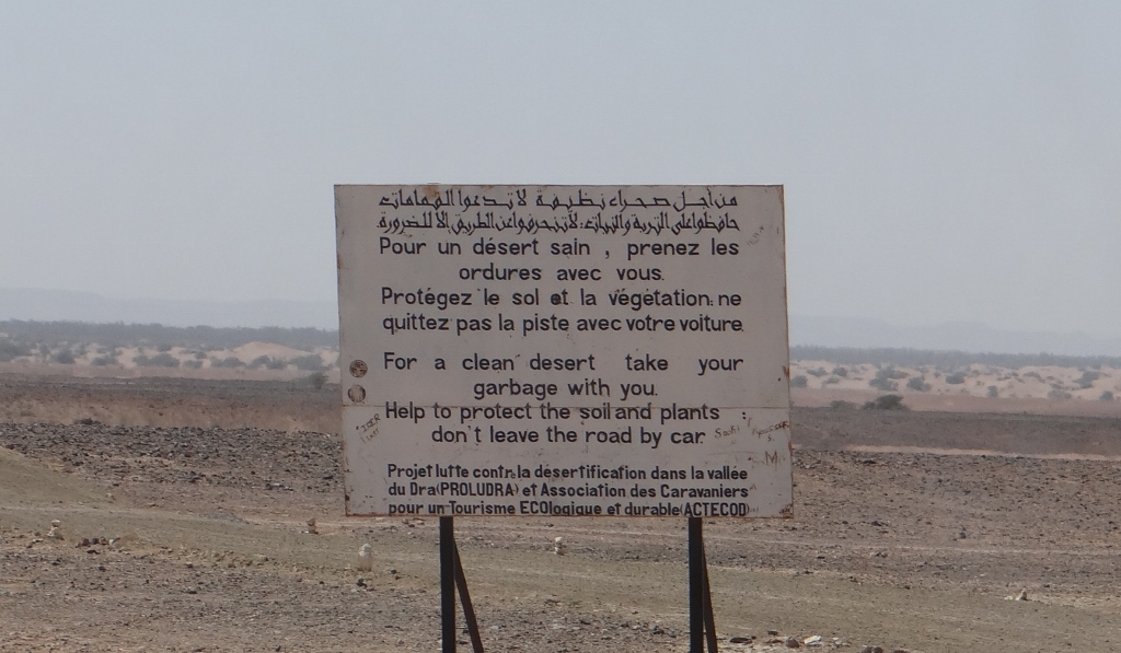 Finally we rejoined the tar, and good stuff at that. As we enjoyed the fresh black-top, the fruits of previous traveller’s misery, and crossed another small pass we were rewarded with graffiti: ‘Welcome to the Sahara’. As we dropped back down into the valley a series of official signs appeared, politely requesting we respect where we were: please don’t drive off the road, please don’t waste water, please take your rubbish with you, please respect our customs.