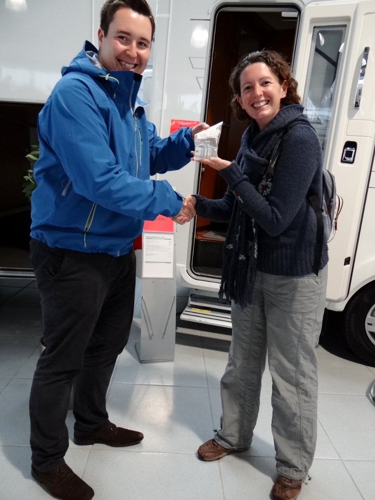Philipp returned with two parts in hand, a trip out to Dave confirmed one of them was it – we had finally found the part, and for cheaper than it cost from the dealer in the UK!! The hinge saga was over. An official handing over ceremony took place outside the 2012 model of Dave (which has a different design of hinge – we checked!). We then had a snoop around their extensive shop at all things motorhome accessory, oh the money we could burn through.