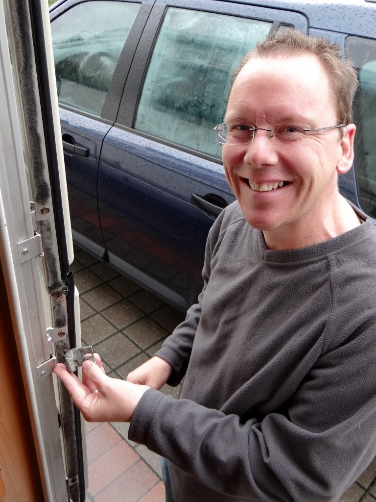 Driving along it soon became clear it was inside the umweltzone, but as we were on a mission for a hinge we ploughed on – keeping an eye open for any police cars. We arrived at the dealership and asked for Philipp as instructed (our contact Sebastian was on holiday this week even though he emailed us around 11pm the other night to tell us they were closed for a bank holiday). We explained our mission to find the elusive hinge and he set off ‘out back’ leaving us to drink as much expensive coffee and eat snacks – and more importantly nose around all the new motorhomes!