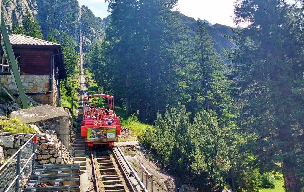 Soon the ticket office was a dot below us. Don’t get me wrong it doesn’t go fast – around 2 metres a second, but because it rises by 448m in just over a kilometre of track, you’re quickly looking at snow-capped mountains instead of the green gorge below. It wasn’t really an adrenaline ride, but it was still good fun and had us chuckling as it kept going steeper just when we thought it had maxed out.