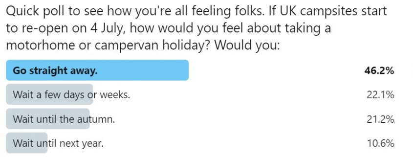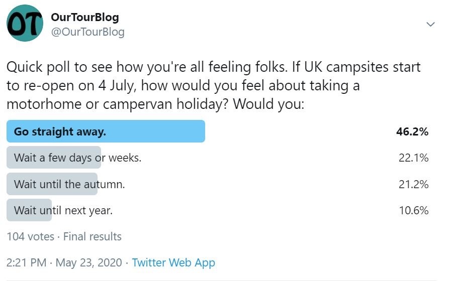 We’ve created a Twitter poll asking how you feel about motorhome travel in the UK. It was open for 24 hours, and got 104 responses: see below for the results. [edit: a reader in Scotland has quite rightly pointed out that the 4 July date only applies to English sites, not those in Scotland, NI or Wales]