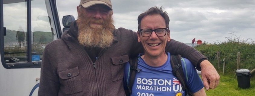 To keep his costs down Geraint’s sleeping rough. Not a problem for him, as he once spent four years living in a tent in the woods in Scotland (yes in the winter too!). He once woke up scared he was dying as he couldn’t breathe, but it turned out his beard had frozen across his mouth, it was that cold. I looked at his wind-battered face and calloused hands and told him trying to sleep on benches and the like would do me in. “Yeah, I feel like I’m 105” he said (he’s 51). “Have you got a mat?”, “yeah, I’ve got one on my pack”, gesturing slightly at all his worldly goods lying on the grass outside. “What about a pillow?”, “nah, I roll up my coat”. All of this was very understated, all in a day’s work. He’s clearly one tough bloke. Ju and I have sold/given away most of our stuff over the years and lived in small spaces for a decade. Ju’s marathoned and I’ve run the odd ultramarathon. It’s all been an absolute piece of cake compared with how Geraint lives. Humbling stuff.