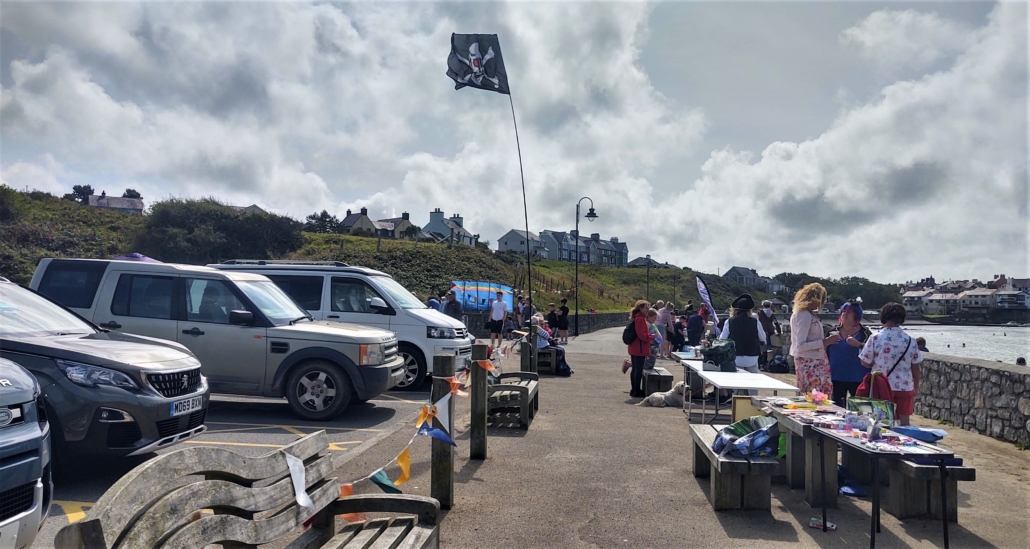 The Football World Cup wasn’t the only thing starting at 11am on Sunday, Cemaes was hosting its annual beach extravaganza. As the match didn’t go into extra time, we were able to wander down to ‘big beach’ to see what was happening. There were lots of folks dressed as pirates for the fancy dress competition and a few stalls such as ‘guess the number of sweets in the jar’, ‘a coconut shy’ and ‘drop a coin on a metal disc in a paddling pool’, not to mention the obligatory tombola. Sadly we missed the sandcastle building competition and the subsequent sandcastle destroying fun that followed.