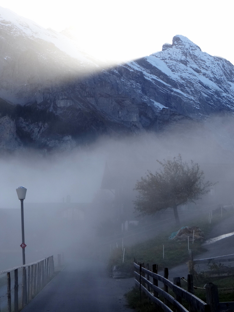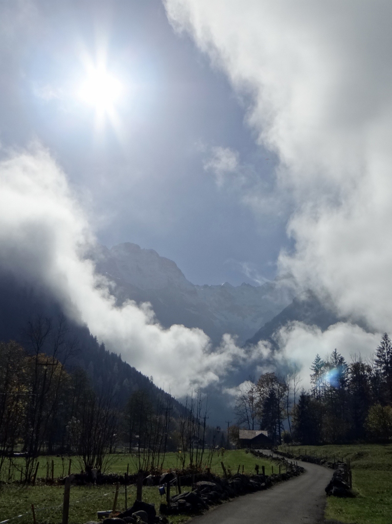 All too soon it was time to go, we’d only bought a one way ticket as the plan was to walk back down using the wanderwegs and bergwegs (nice and rocky footpaths!). The guide said it would take around an hour and a half, who were they kidding! As we walked back down to Gimmelwald we reached the cloud, the air turned cooler and the sun set behind one of the nearby mountains.
